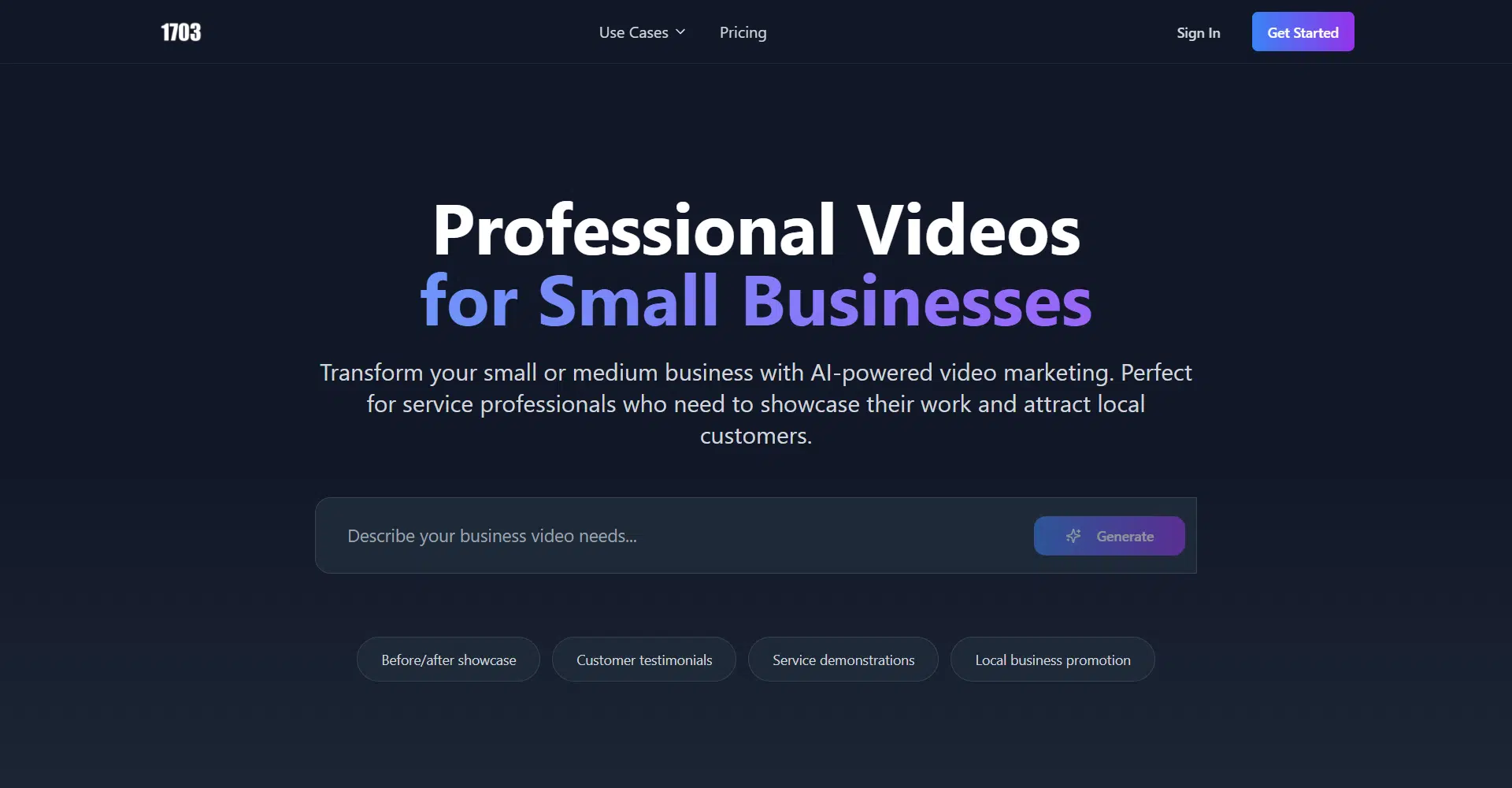 1703 Media is the ultimate solution for small and medium-sized businesses that want to stand out with professional video marketing—without the high cost or complexity of traditional production. Built with AI-powered video creation, it helps service professionals like cleaners, landscapers, roofers, plumbers, HVAC companies, and more showcase their expertise, attract local customers, and build trust.