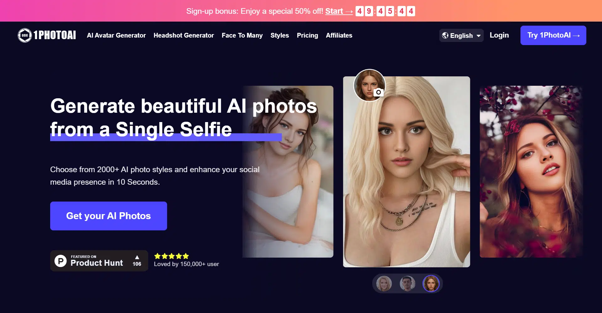 1PhotoAI is a cutting-edge tool that allows users to generate stunning AI photos from a single selfie. In just 10 seconds, individuals can choose from over 2000 AI photo styles, significantly enhancing their social media presence.