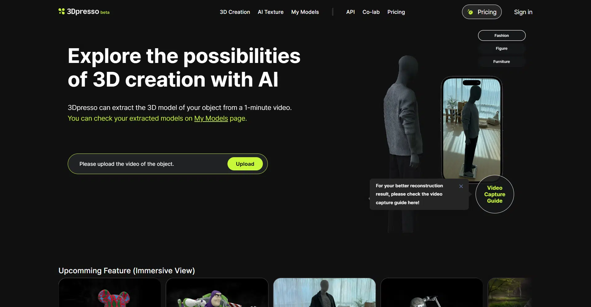 Step into the future of 3D creation with 3Dpresso, where your ideas come to life with the magic of artificial intelligence. Imagine turning a mere 1-minute video into a stunning 3D model, it’s not science fiction, it’s 3Dpresso in action. Just upload your video and let the AI work its wizardry, capturing every curve, texture, and light play to craft a lifelike digital masterpiece.
