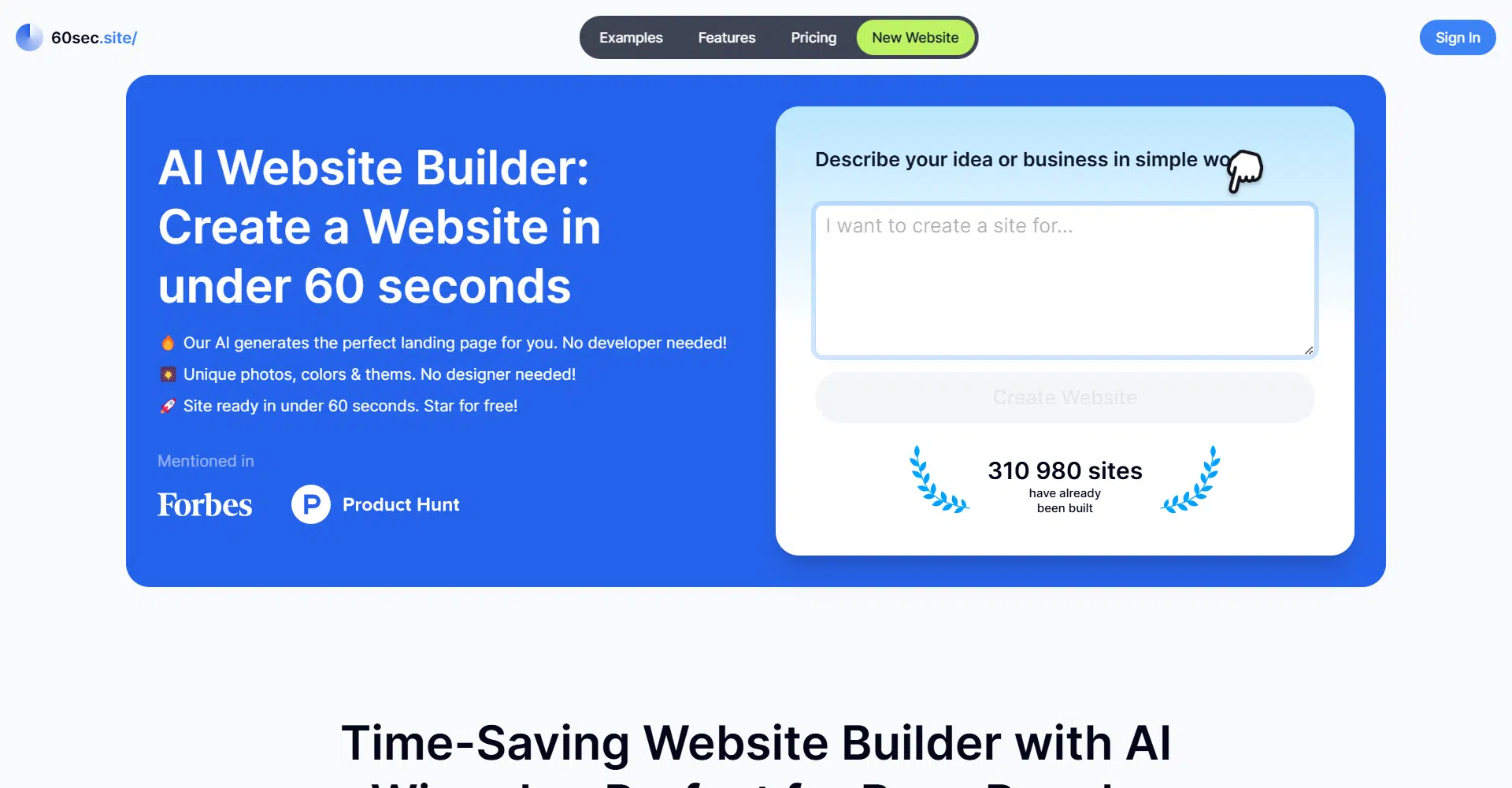 60Sec Site is the ultimate solution for creating stunning websites quickly and effortlessly. This AI-powered website builder allows you to craft a professional landing page in under 60 seconds—no coding or design skills required. With unique photos, customizable themes, and vibrant color palettes, 60Sec Site makes it easy to launch a site that looks and performs like it was built by experts.