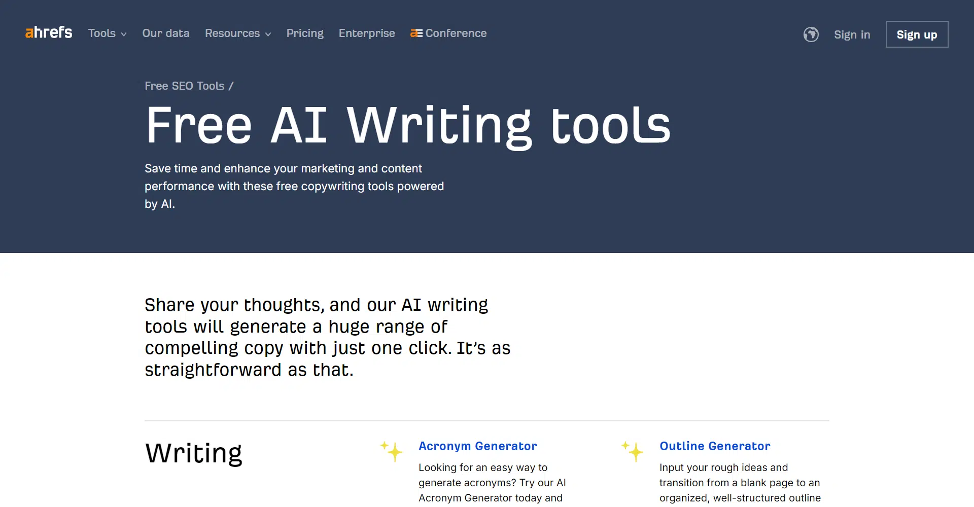 Boost your marketing prowess with Ahrefs’ free suite of SEO and AI writing tools, designed to enhance your content performance effortlessly. Trusted by marketers worldwide, Ahrefs simplifies complex tasks with intuitive tools that generate impactful results with just a few clicks.
