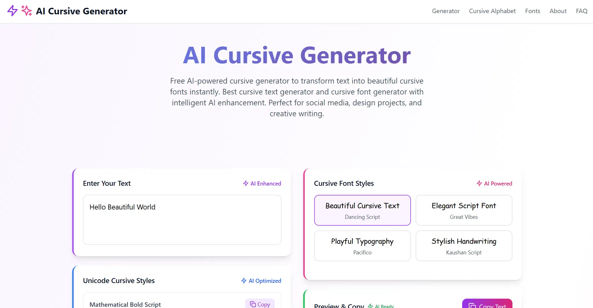AI Cursive Generator is a free, AI-powered tool designed to transform plain text into beautiful cursive fonts instantly. This tool combines both a cursive text generator and a cursive font generator, allowing users to create elegant, flowing handwriting styles for use in social media, design projects, creative writing, and more. The AI enhancement ensures optimal font selection, real-time processing, and intelligent styling, making it a versatile tool for professionals and hobbyists alike.