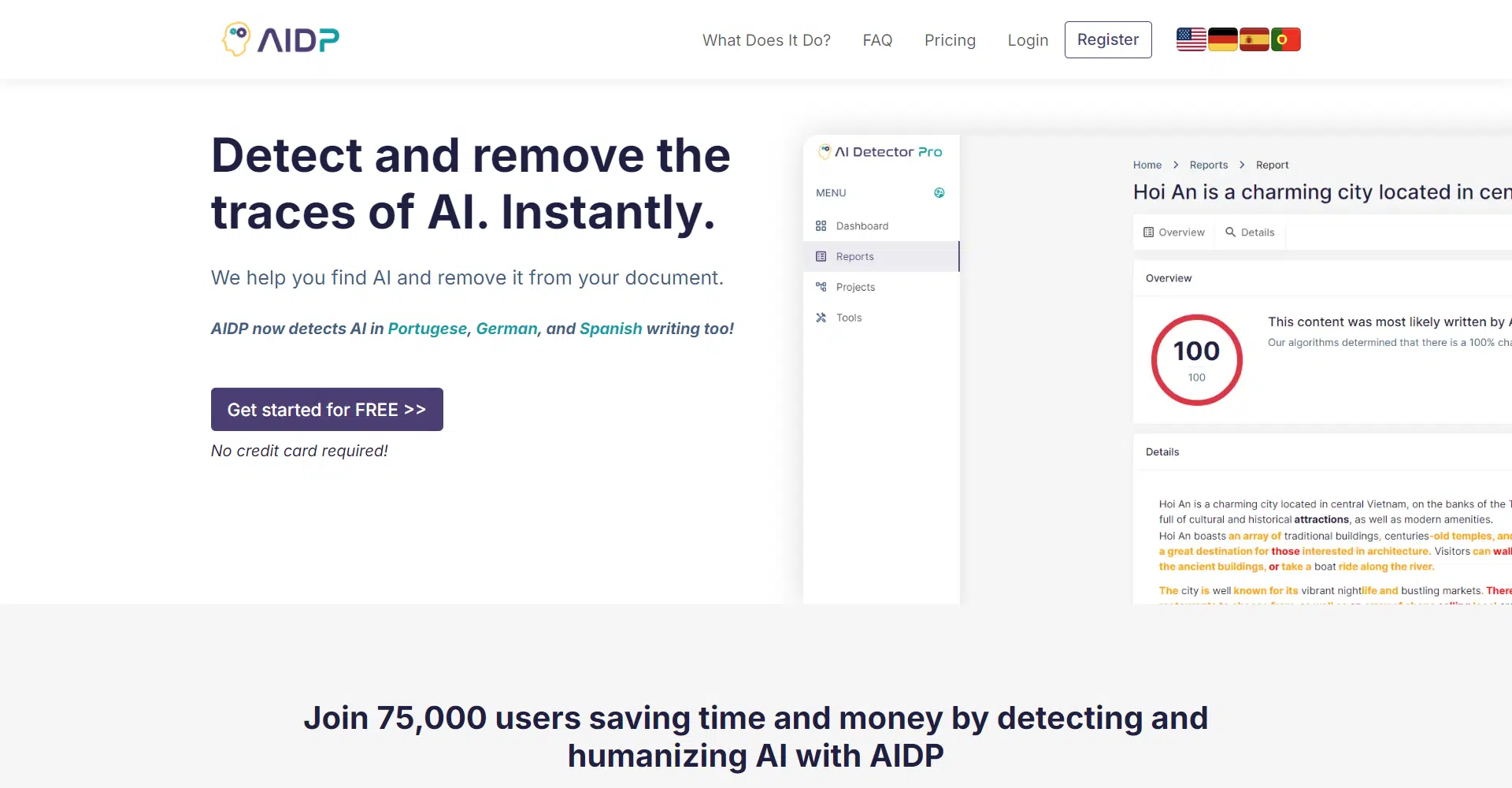 Discover the ultimate tool to make your writing sound truly human with AI Detector Pro. Whether you’re a content creator, writer, or simply someone looking to polish your documents, AIDP offers a complete solution to identify and remove AI-generated content. This advanced platform doesn’t just detect AI in your English text, it now works in Spanish, German, and Portuguese too!