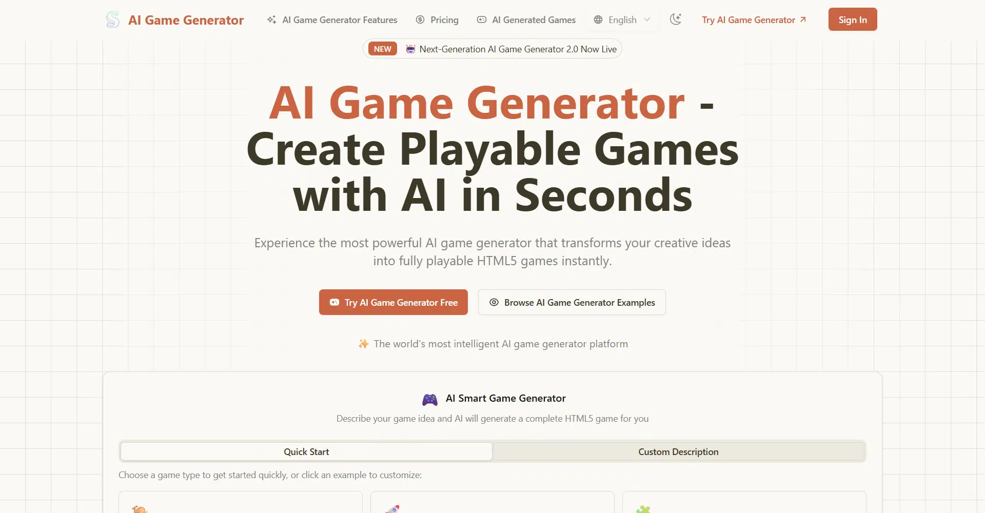 AI Game Generator is an innovative platform that lets you turn text prompts and simple ideas into playable HTML5 games in minutes without writing a single line of code. Just describe your vision — whether it’s a platformer, shooter, puzzle, racing, arcade, or strategy game — and the AI builds a fully functional, browser‑ready game world with controls, scoring systems, UI, and responsive gameplay. You can preview games instantly, remix community builds, and refine your prompts until you get the experience you want.