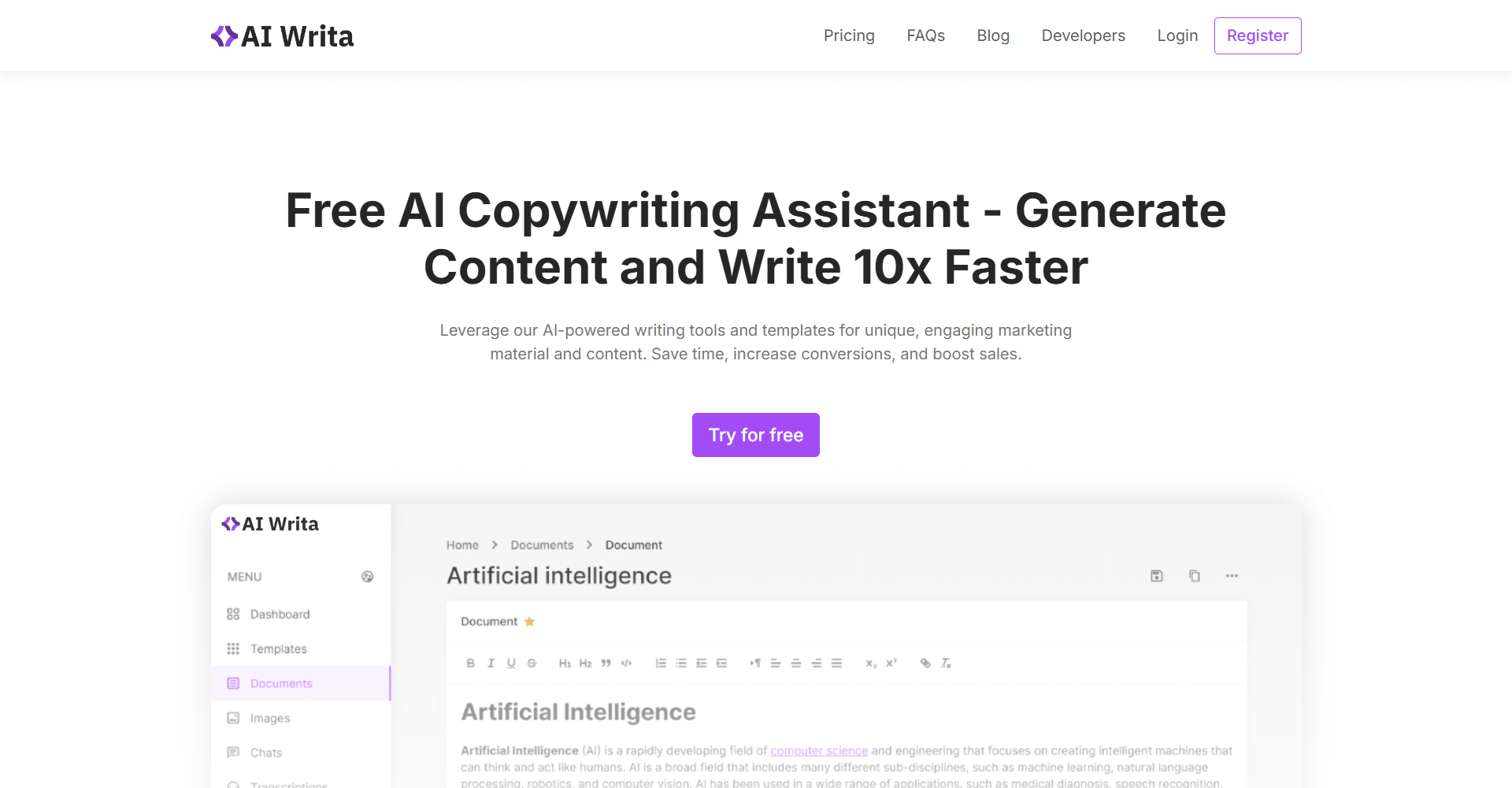 Write 10x faster with Aiwrita—your free AI copywriting assistant for unique, engaging content that saves time, boosts sales, and grows your business.