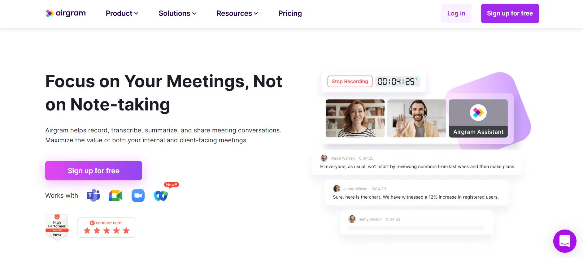 Airgram is an AI-powered meeting assistant that helps users record, transcribe, and summarize meetings automatically, making it easier to stay focused during conversations. They integrate with platforms like Zoom, Google Meet, Microsoft Teams, and Webex, allowing users to capture meetings without manual effort. The platform converts conversations into searchable transcripts, summaries, and action items, helping teams keep track of decisions and follow-ups.