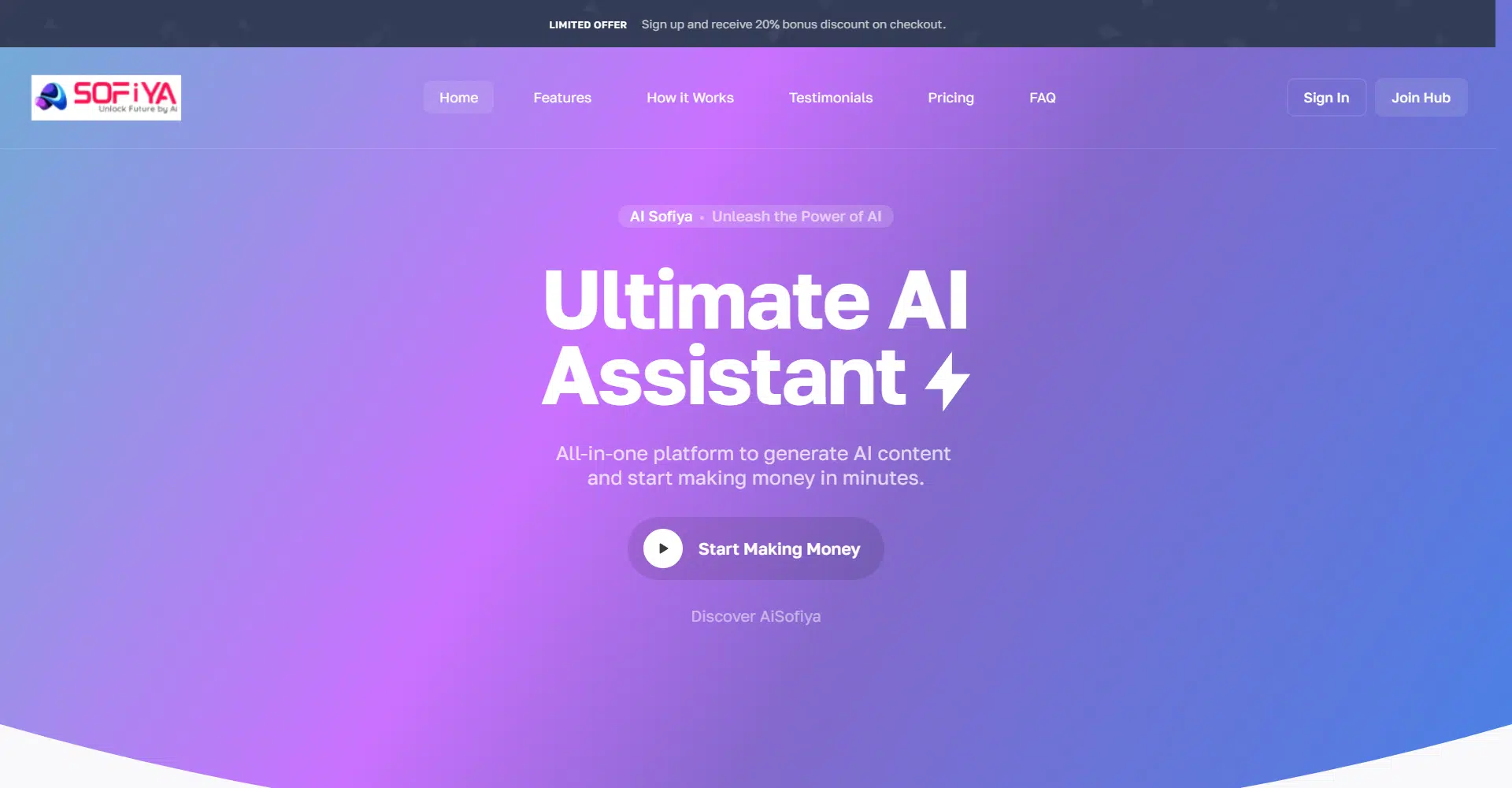 AiSofiya is your all-in-one AI platform that helps you create content and start making money in no time. Whether you need text, images, code, or even chat responses, AiSofiya has it all. It’s built to handle everything from writing blog posts and designing product descriptions to generating social media captions and creating engaging video scripts.