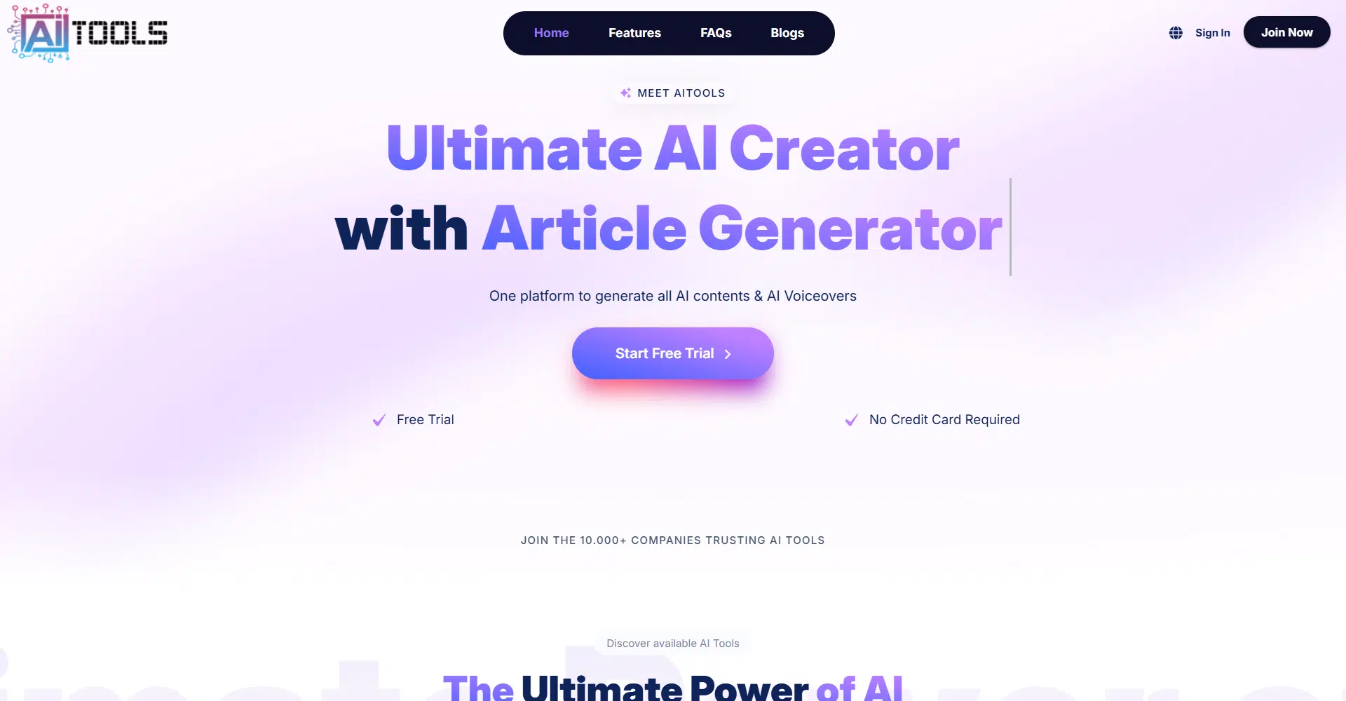 AI Tools is your all-in-one AI content creation platform designed for writers, marketers, creators, and businesses who want to save time and get professional results. From AI article generators, blog content, and ad copy, to text-to-speech, voiceovers, and image creation, this platform covers every aspect of content and media production. You can even use AI-powered bots, trained by conversion and industry experts, to handle customer chats and information delivery with speed and accuracy.