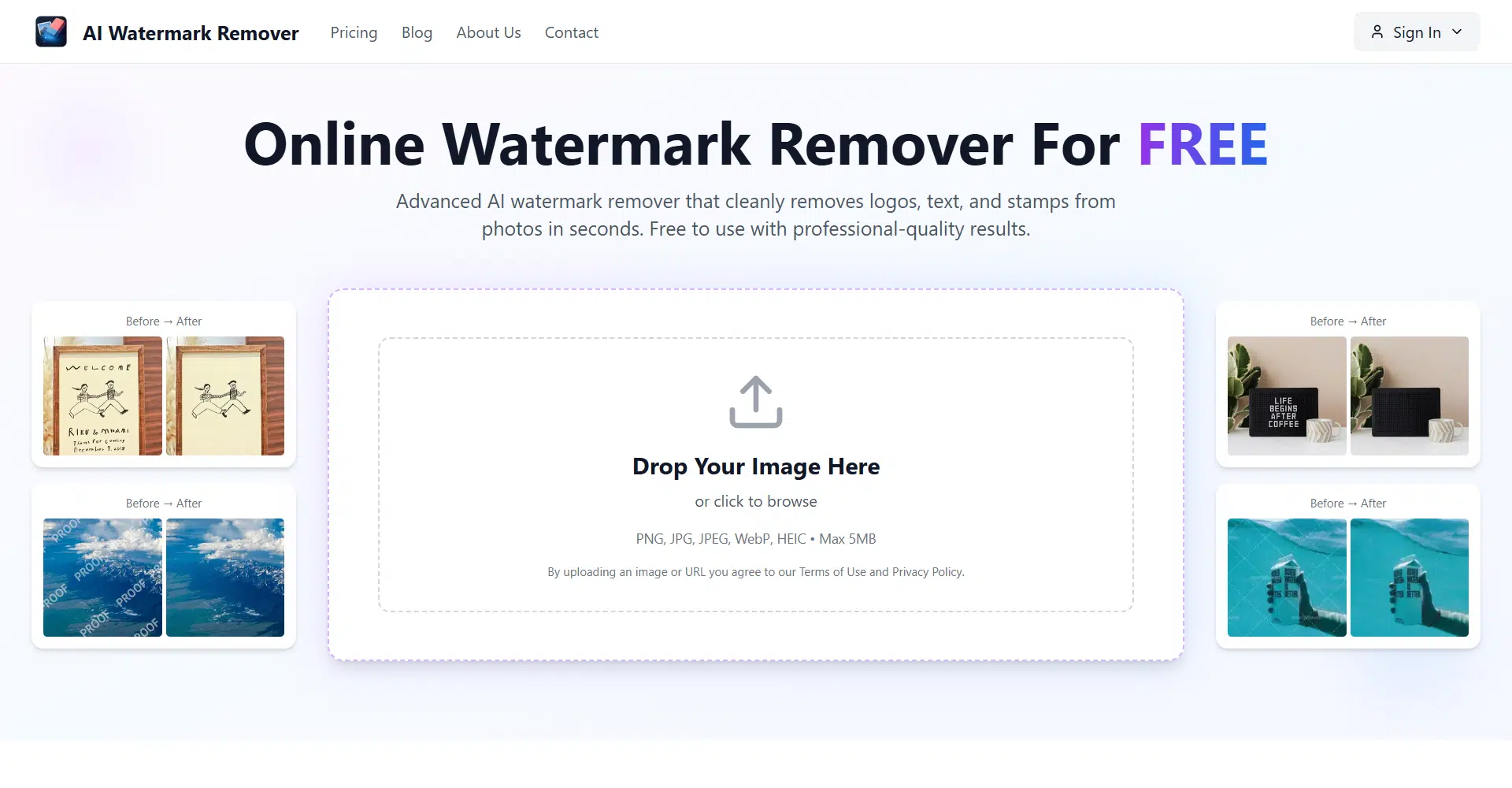 AI Watermark Remover is the simplest way to clean your images from unwanted text, logos, and stamps in just seconds. With smart AI detection, the tool automatically identifies watermarks without requiring you to manually select areas. It works on PNG, JPG, JPEG, WebP, and even HEIC formats, keeping things smooth and hassle-free.