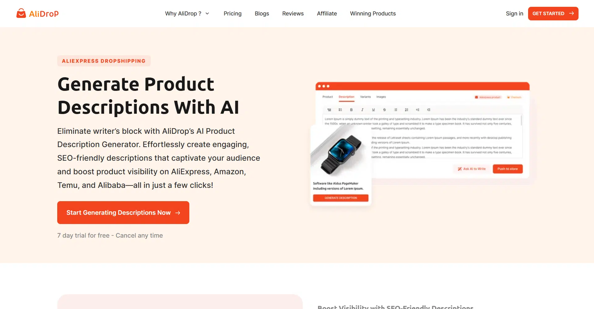 Ready to try it? Start with their 7-day free trial and experience the difference! Create compelling, SEO-friendly product descriptions and watch your dropshipping business thrive—all without spending a dime upfront. Don’t wait—unlock your store’s potential today!