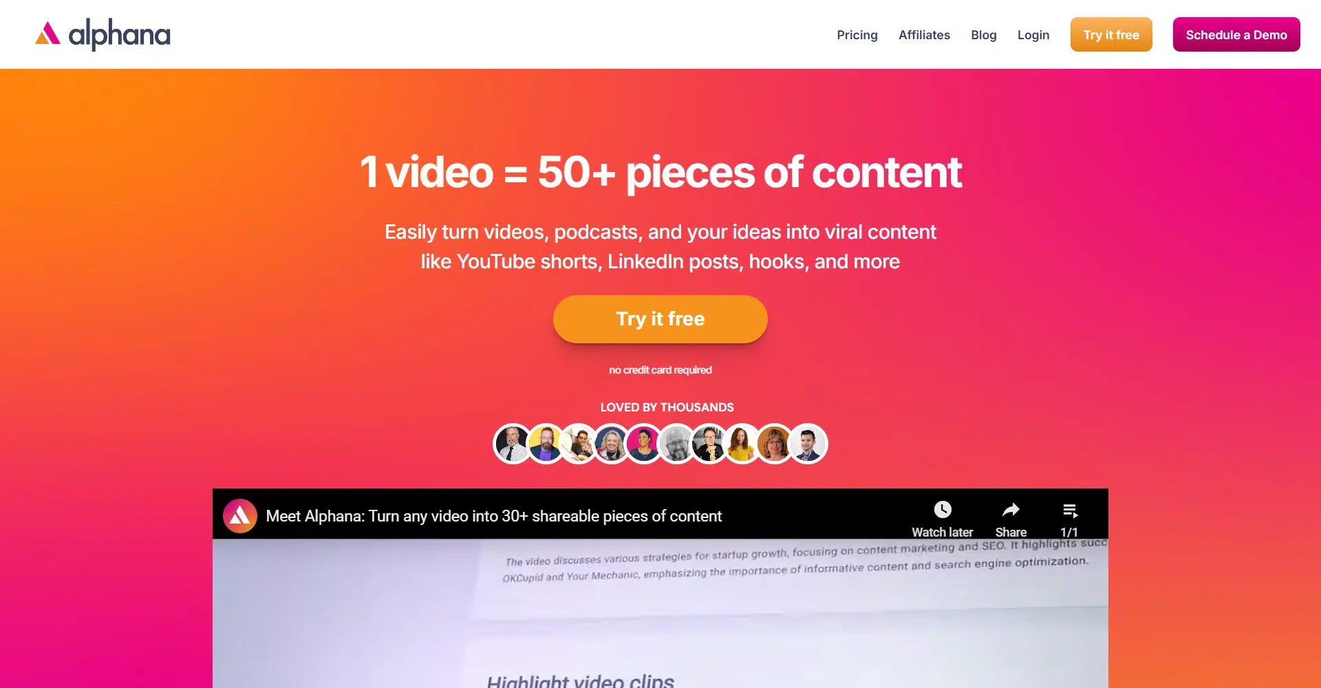 Alphana’s powerful AI cards combine natural language prompts with an intuitive interface, letting you generate content like automatic transcriptions, auto-highlight clips, X (Twitter) threads, LinkedIn posts, newsletters, and more. You can even create meeting notes and summaries, breaking down long meetings into highlights and key takeaways.