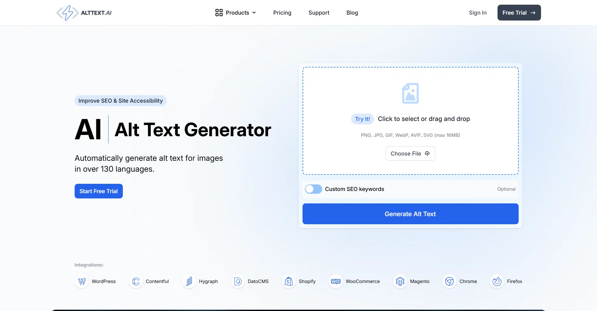 What sets alttext apart is its support for modern formats like AVIF and SVG, along with classic types like PNG and JPG. It works perfectly with platforms like WordPress, Shopify, WooCommerce, Contentful, DatoCMS, Magento, Hygraph, and more. You can also use the Chrome or Firefox extensions to generate alt text instantly while browsing or editing sites.