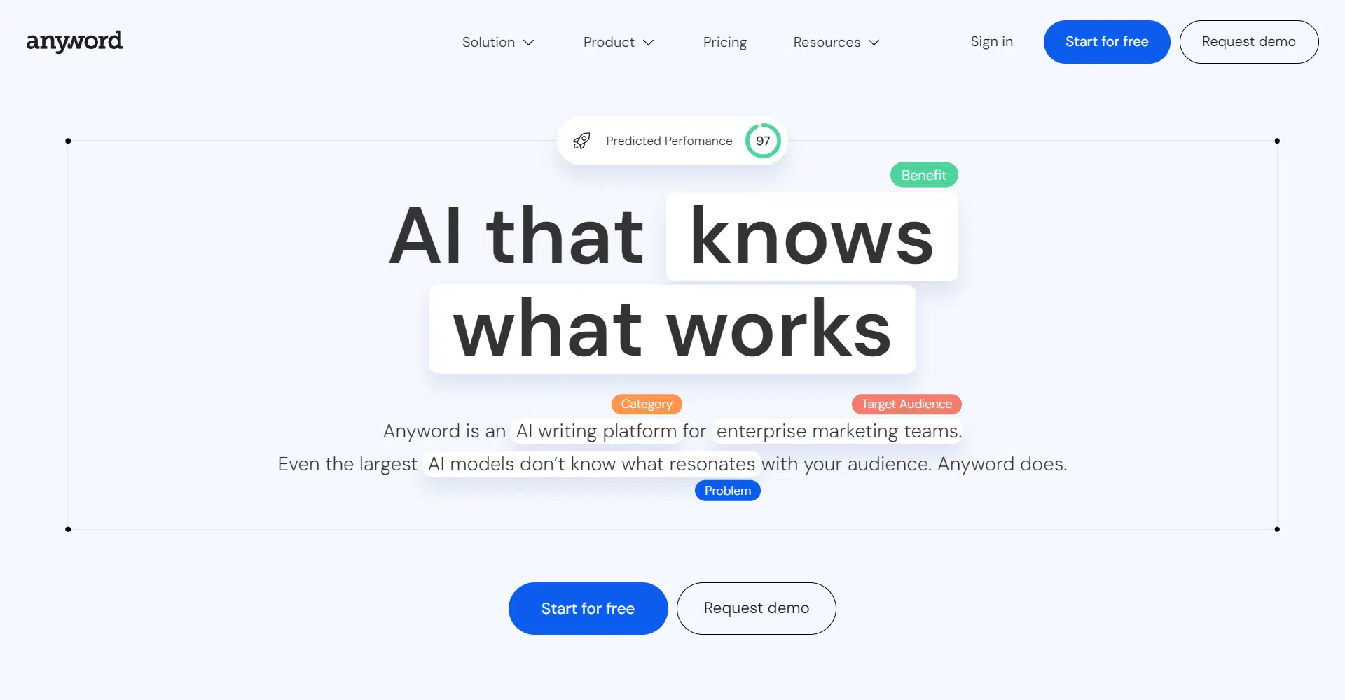 Step into the future of marketing with Anyword, your all-in-one AI writing companion designed exclusively for enterprise marketing teams. Anyword takes the guesswork out of content creation, providing a powerhouse of features that elevate your marketing game.