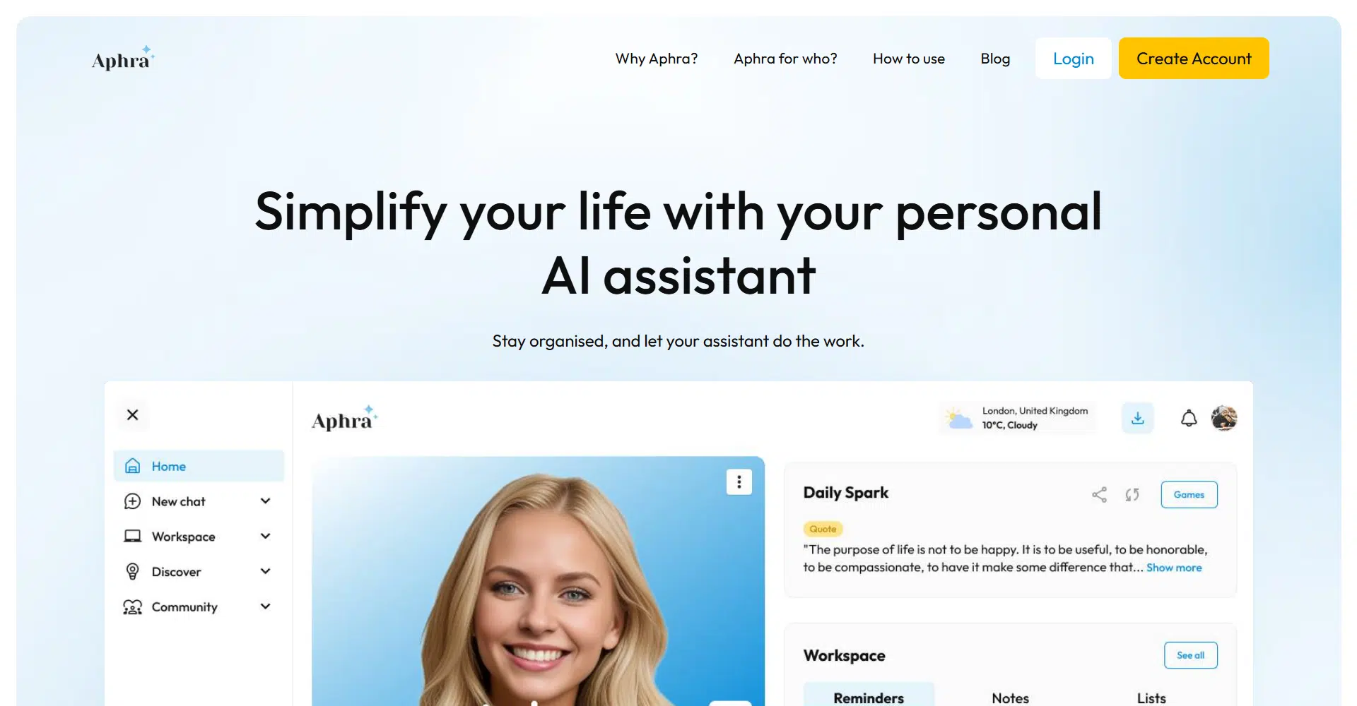 And the best part? Aphra offers a free plan with access to an AI Text Generator, Lifelike AI Chat, 46 Basic Voices, and more. Experience the future of personal assistance with Aphra—your AI-powered companion for a smarter, more organized life.