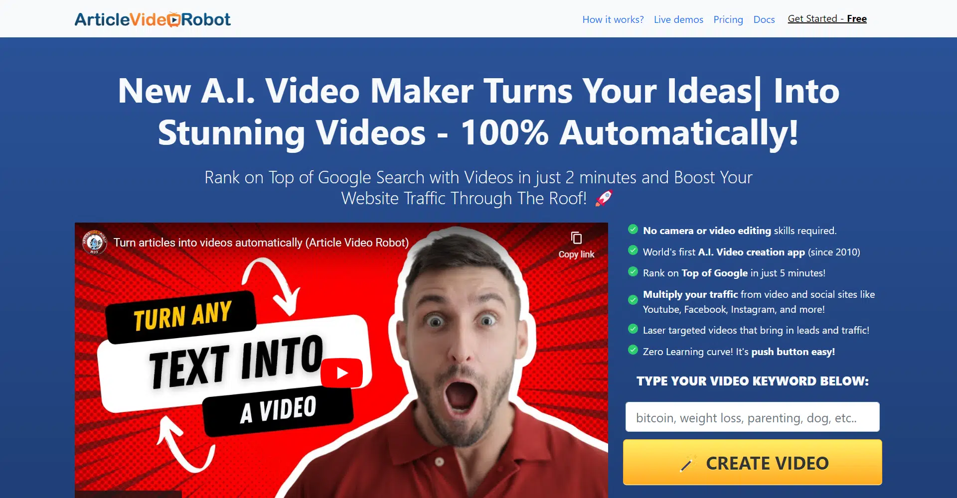 Are you tired of writing endless articles with little to no engagement? Say goodbye to the old ways of content creation and embrace the future of video marketing with Article Video Robot! This innovative AI-powered app allows you to turn your keywords into stunning videos in just two minutes, no camera or editing skills required!