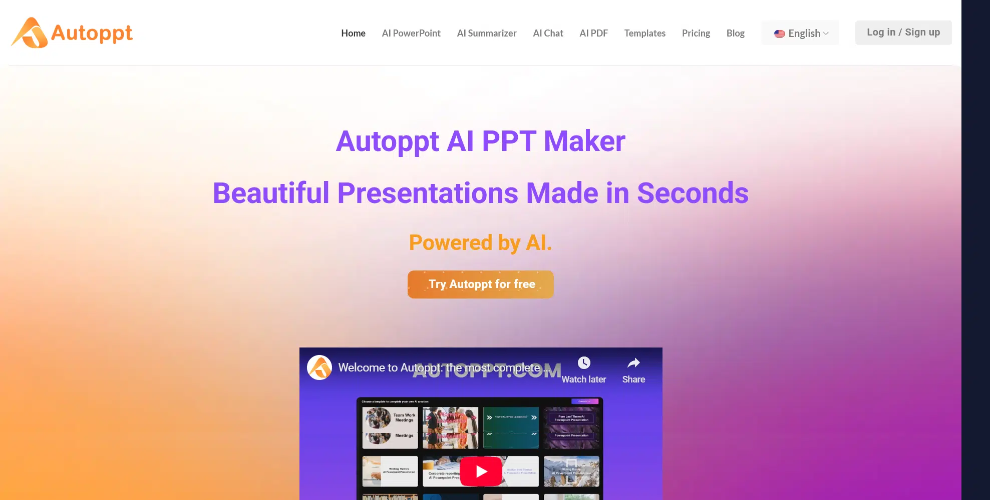 Autoppt is the ultimate tool for effortlessly creating stunning PowerPoint presentations in just seconds. Powered by AI, Autoppt allows you to generate beautiful, professionally-designed slides with ease. Simply enter your topic, and the AI does all the work, instantly creating a complete, well-designed slideshow. Whether you’re preparing a business pitch, academic presentation, or any other type of slide deck, Autoppt makes it fast and easy.