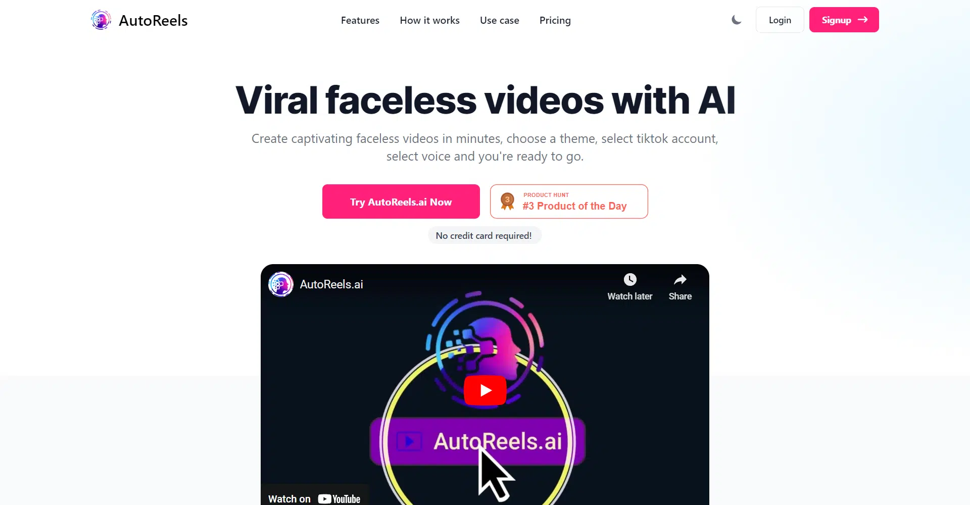 Are you looking to produce captivating faceless videos that stand out on social media? AutoReels makes it effortless to craft unique, engaging content in just minutes. With AutoReels, you can choose your theme, select a TikTok account, pick a voice, and watch as your faceless video comes to life.