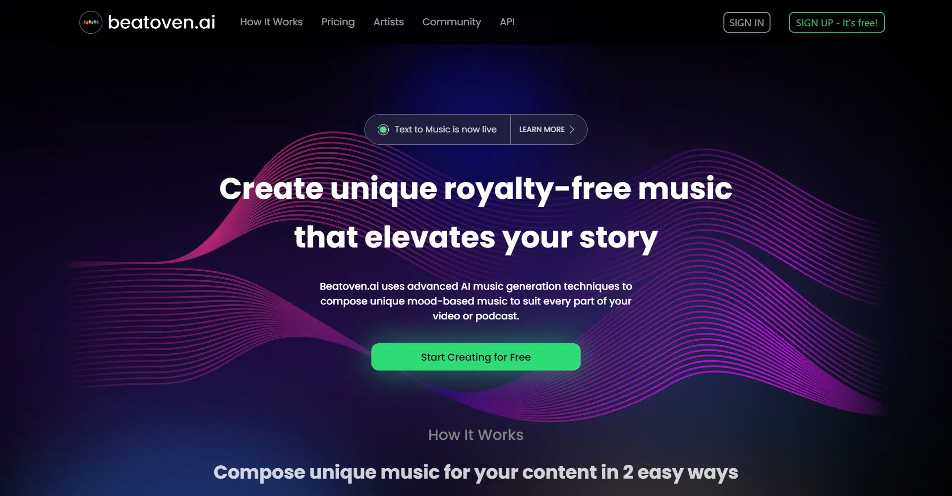 Discover a revolutionary approach to music creation with Beatoven.ai, your go-to platform for crafting bespoke royalty-free tunes. The newly launched Text to Music feature is a game-changer, harnessing the power of advanced AI technology to effortlessly transform your descriptions into tailor-made melodies perfectly suited for your videos, podcasts, and more.