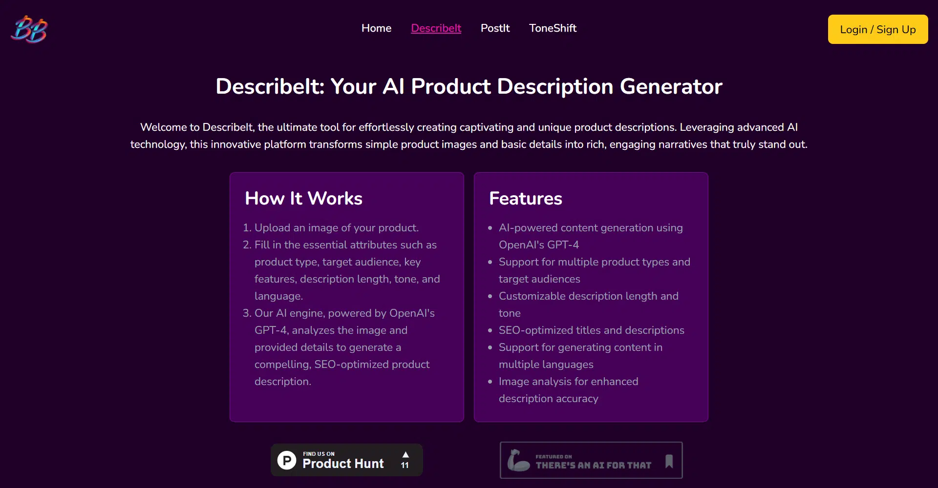BrainBlend AI offers a range of innovative tools to support various needs. DescribeIt is the perfect AI-powered assistant for creating engaging, SEO-optimized product descriptions. By providing just a few images and details, you can rely on DescribeIt to generate captivating descriptions that truly showcase your product. For those focused on social media, PostIt is a valuable asset, enabling you to craft posts that engage and resonate with your audience. With cutting-edge AI, PostIt enhances your online presence effortlessly. Additionally, ToneShift is designed to adjust the tone of your text to match your desired style, whether professional or casual, ensuring your message aligns perfectly with your communication goals.