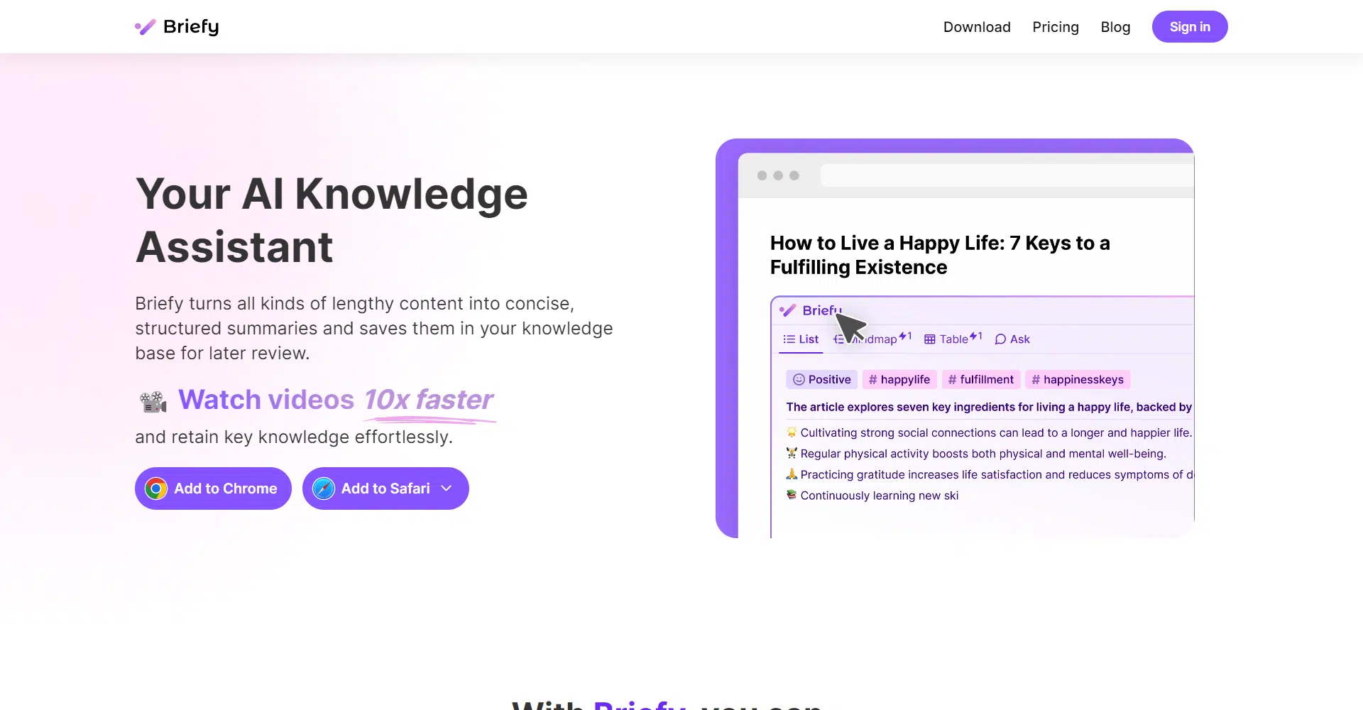 Briefy supports a wide array of content types, from websites and videos to podcasts and emails. It lets you refer back to the original material for a deeper understanding and integrates with your knowledge base, allowing you to save, review, and share your Briefs seamlessly. You can also ask specific questions about the content to get context-aware answers.