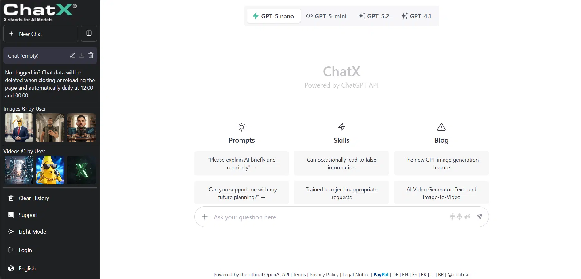ChatX is an AI-powered chat platform that allows users to interact with multiple AI models, generate content, and analyze data without requiring signup. They provide access to GPT-based models, image generation tools, and video creation capabilities, enabling users to handle a wide range of tasks from simple queries to advanced content creation. With features like anonymous chat, model switching, and real-time responses, they make AI tools easily accessible for everyday use.