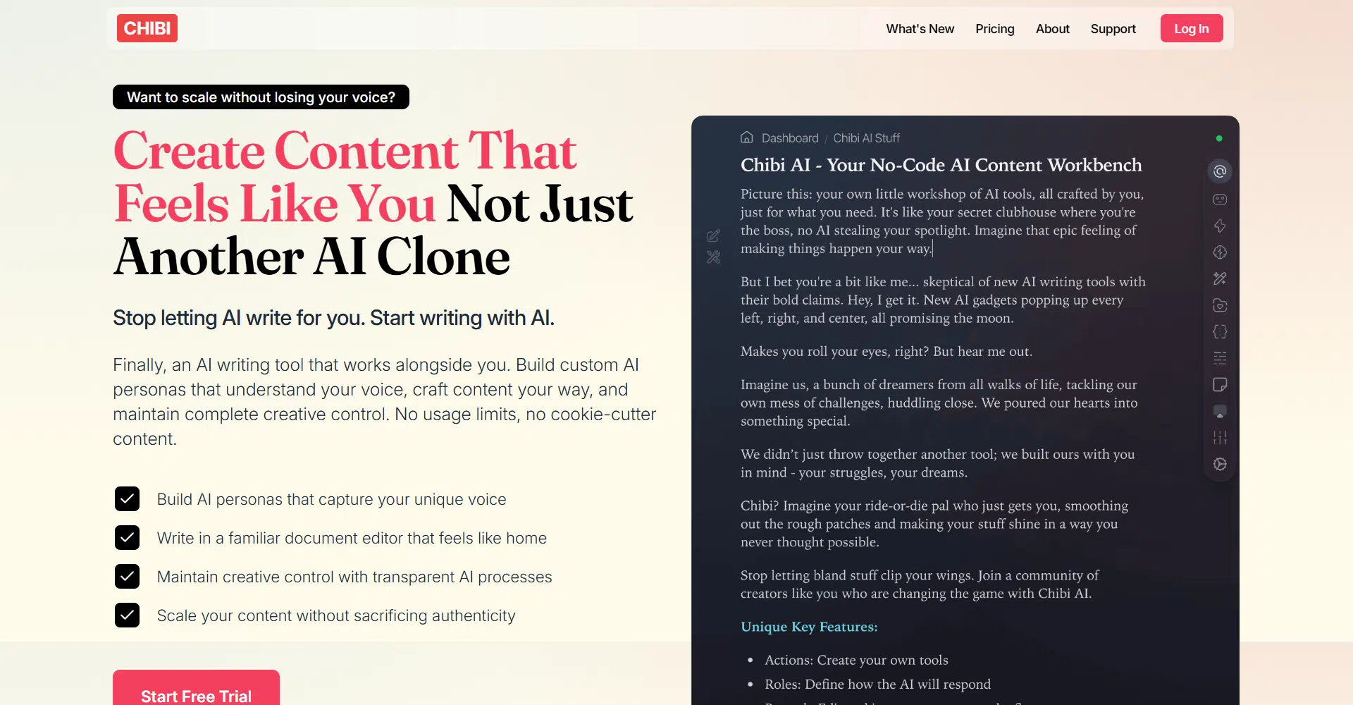 Chibi AI is a game-changing writing assistant built for creators who value authenticity. Instead of replacing your voice, it enhances it—helping you write faster, stay creative, and keep full control of your content. Unlike other tools that spit out the same generic text, Chibi lets you build custom AI personas that match your unique tone, style, and expertise. Whether you’re crafting blogs, emails, scripts, or social posts, Chibi helps you produce content that truly feels like you.