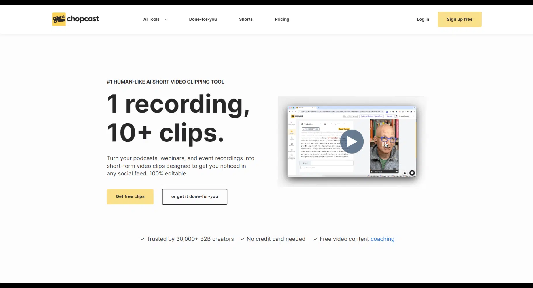 Discover Chopcast, your ultimate tool for transforming lengthy podcasts, webinars, and event recordings into captivating short video clips that shine across social media feeds. With Chopcast, tedious hours of content mining become a thing of the past. Their innovative platform harnesses the power of AI to pinpoint key moments effortlessly. Whether you’re a marketer aiming to boost engagement or a podcaster expanding your reach, Chopcast empowers you to extract, edit, and customize clips with just a few clicks.
