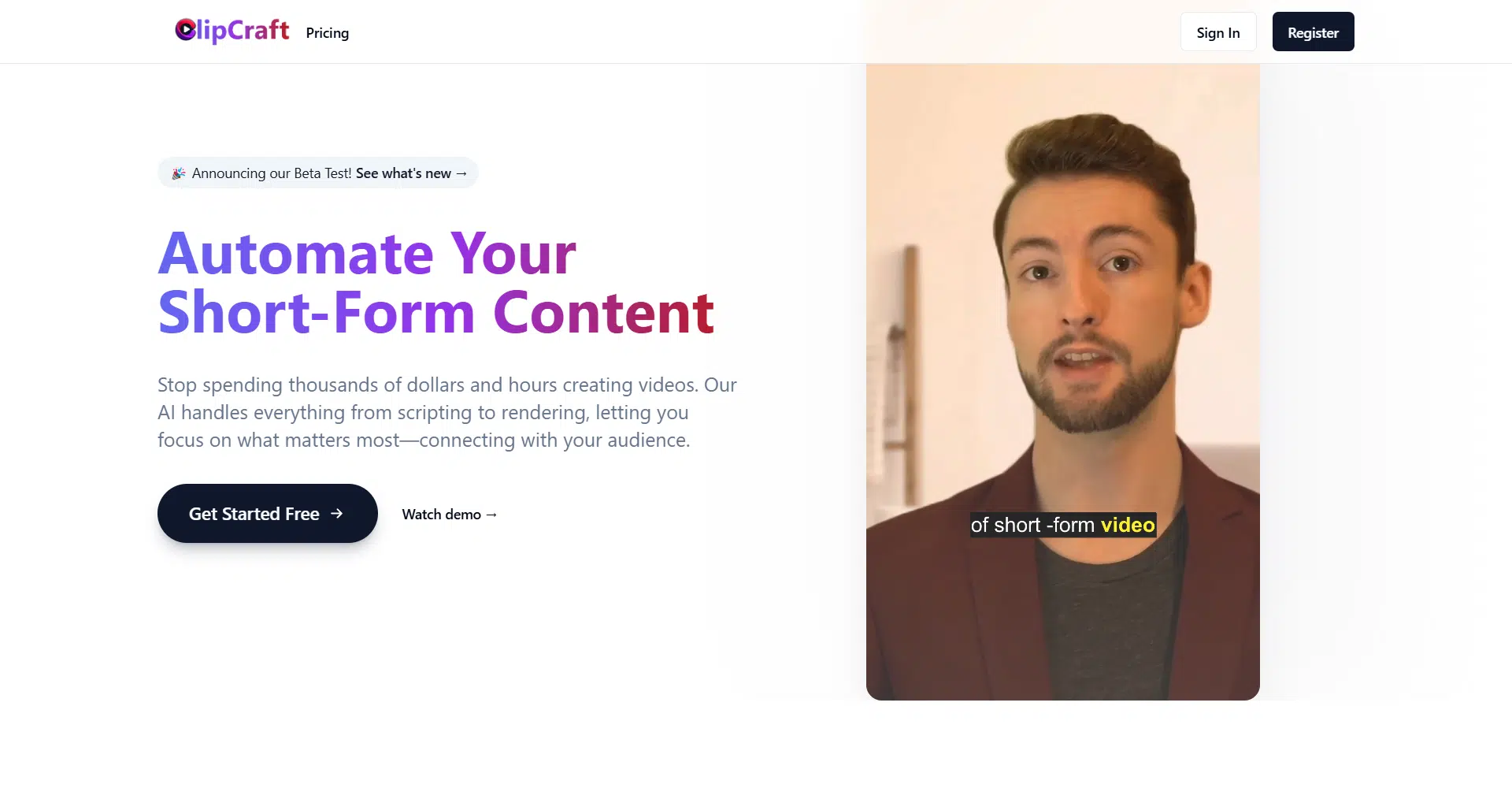 ClipCraft is the ultimate AI-powered tool for automating short-form video creation. No more spending thousands of dollars and countless hours on scripting, editing, and rendering—ClipCraft does it all for you. With just a few clicks, you can transform your ideas into high-quality, engaging videos, freeing you up to focus on what truly matters: connecting with your audience.
