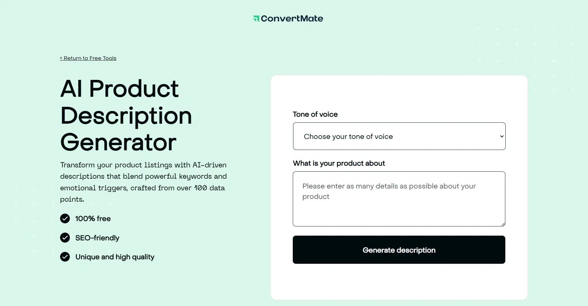 Convertmate is an AI-driven description generator that helps you create compelling product listings with ease. Designed for businesses looking to enhance their online presence, this tool transforms your product pages by crafting SEO-friendly and high-quality descriptions that are uniquely tailored to your brand. Using over 100 data points, Convertmate ensures your descriptions blend powerful keywords and emotional triggers to not only catch attention but also drive sales.