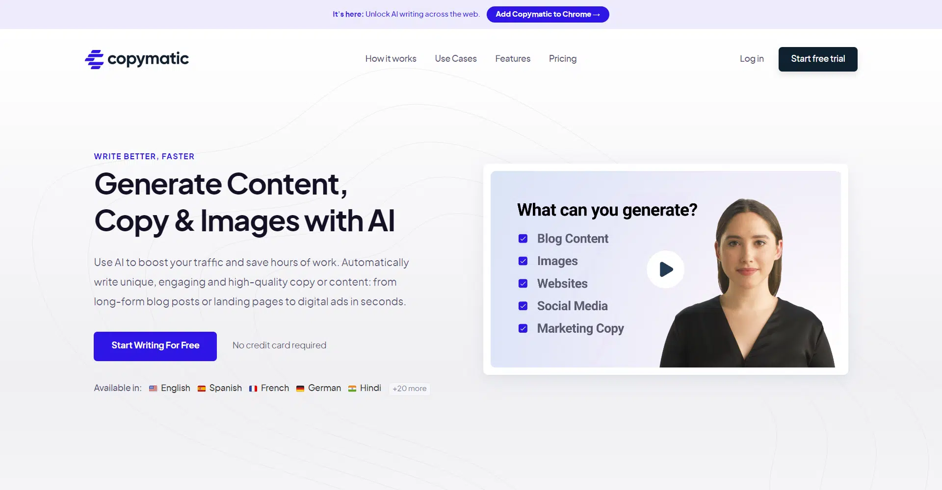 Welcome to Copymatic, your passport to a revolution in content creation! Imagine writing better and faster without the hassle—that’s exactly what Copymatic offers. In just three easy steps, you can transform your ideas into captivating copy, thanks to our arsenal of AI tools designed for social media ads, hero sections, blog posts, and more.