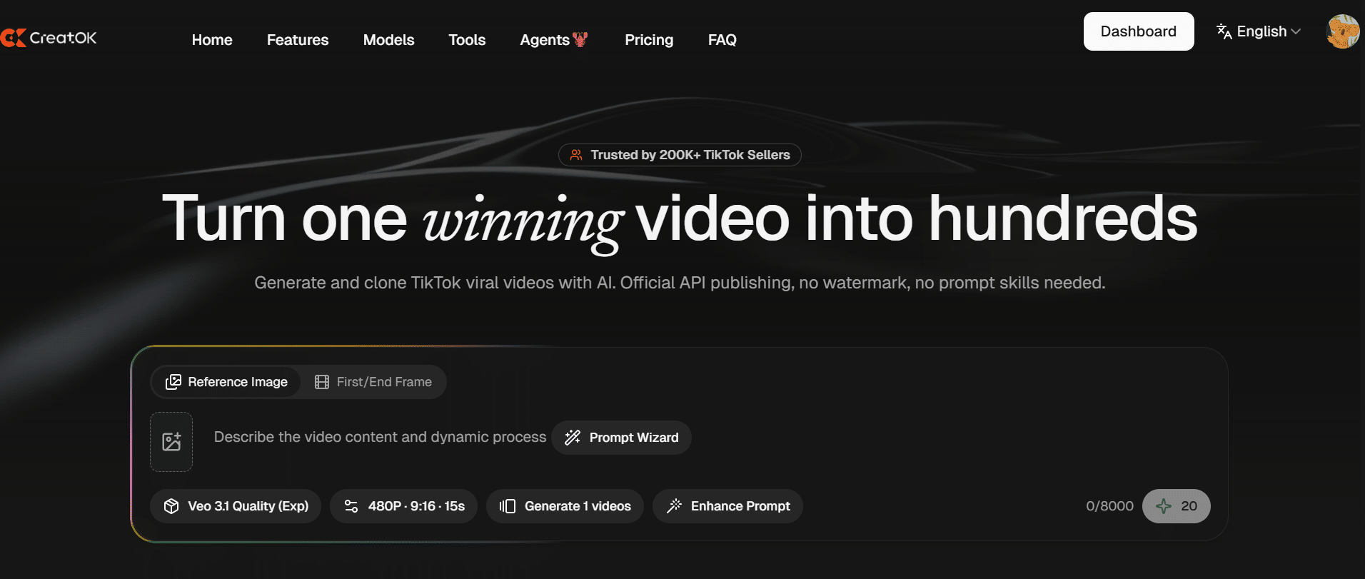 CreatOK is an AI TikTok e-commerce video generator based on Soar, Wan, Seedance, VEO, Nano Banana Pro, Kling and so on. Turn one winning video into hundreds. Generate and clone TikTok viral videos