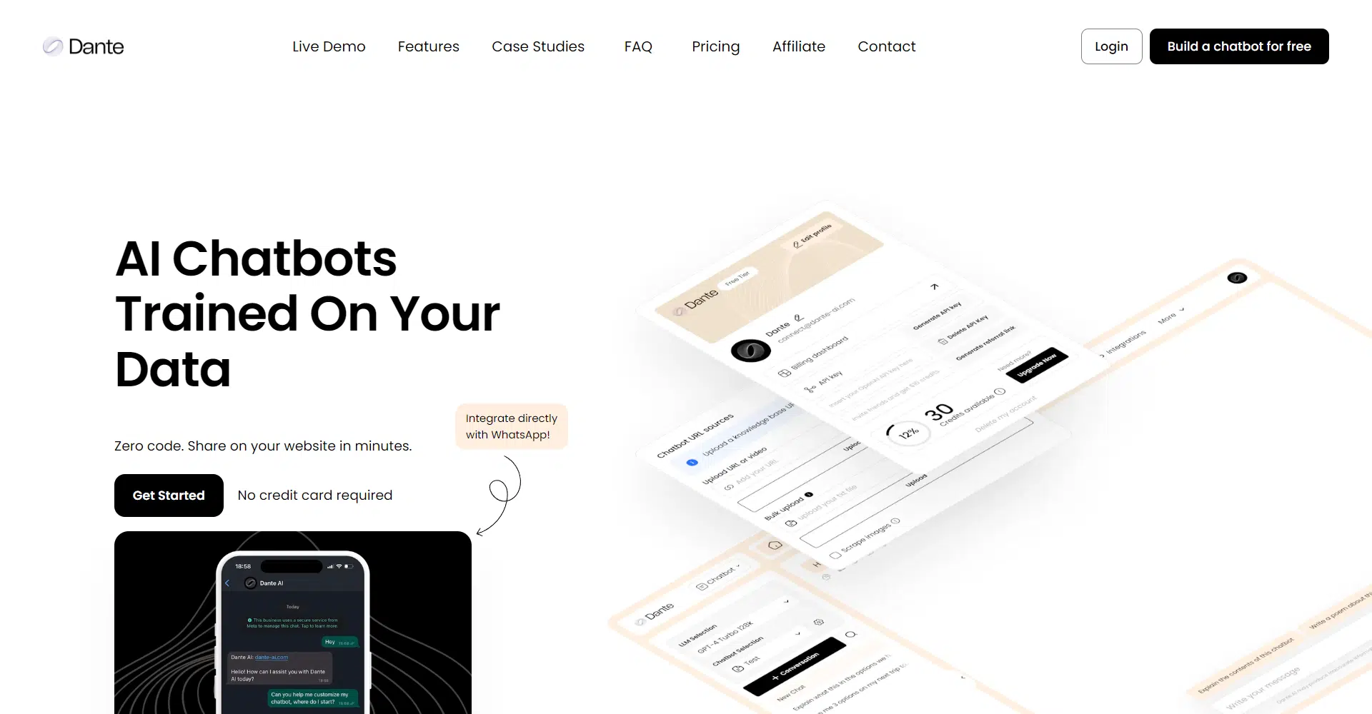 Welcome to Dante AI, your passport to effortless AI chatbot creation! With our platform, you can unleash the power of cutting-edge language models like OpenAI’s GPT-3.5 Turbo, GPT-4, GPT-4 Turbo, LLaMA 2, Falcon, Cohere, and more, all without a single line of code. Imagine crafting your own intelligent virtual assistant in minutes, ready to chat seamlessly on your website or WhatsApp—it’s that easy!