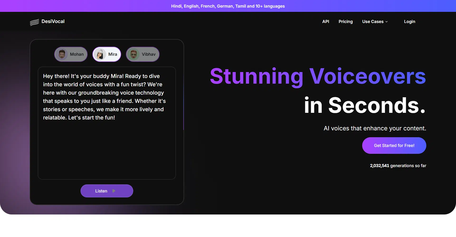DesiVocal is your go-to solution for creating stunning voiceovers in just seconds, offering AI-powered voices that add depth and professionalism to your content. Whether you need a voiceover in Hindi, Tamil, or English, DesiVocal makes it seamless to transform text into engaging audio.
