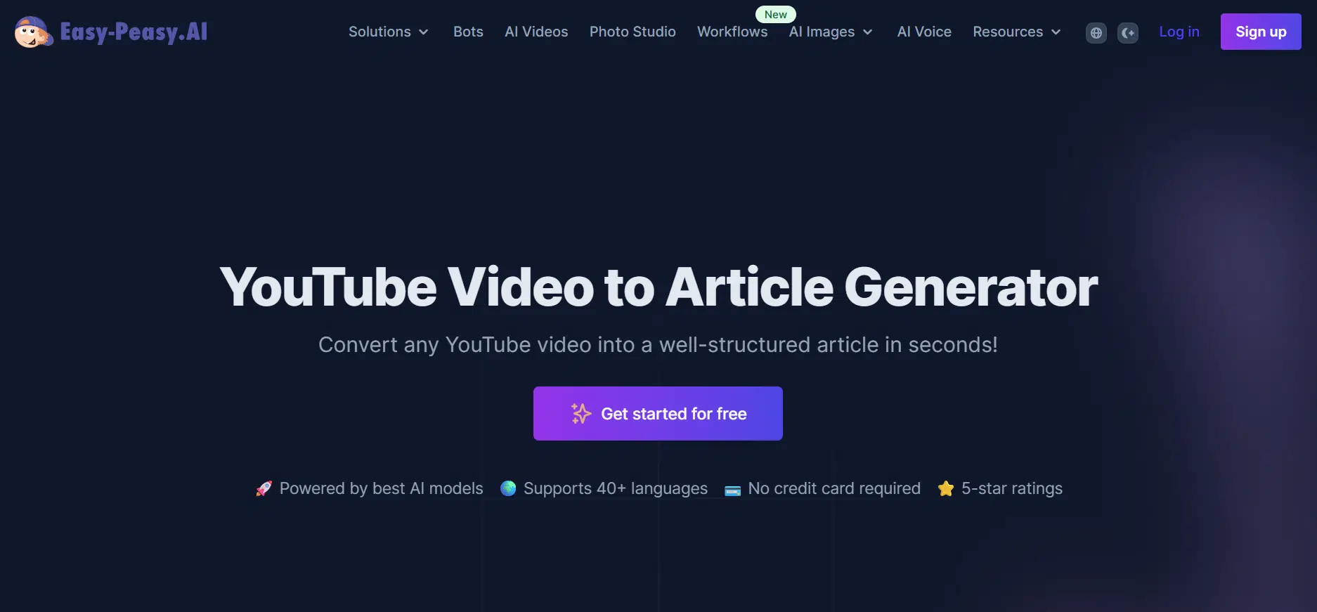 Easy Peasy AI YouTube Video to Article Generator is an AI-powered content conversion tool designed to transform YouTube videos into structured, high-quality articles in seconds. They allow users to input a video URL and automatically generate well-formatted written content, saving hours of manual work. With support for 40+ languages, custom tone selection, and adjustable output length, they help users create content tailored to different audiences and platforms.