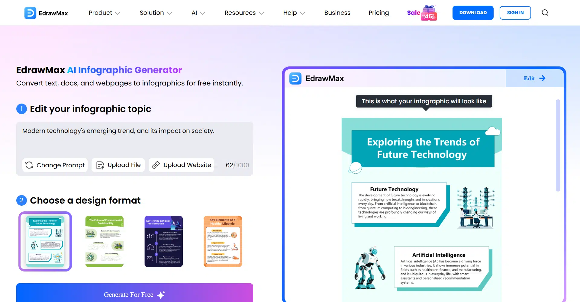 This platform saves time by allowing users to generate infographics from various prompts, including plain text, documents, and even webpages. Once your infographic is generated, you can easily customize it using EdrawMax’s comprehensive suite of editing tools. Add your personal touch with just a few clicks, adjusting colors, fonts, and layouts to fit your vision perfectly.