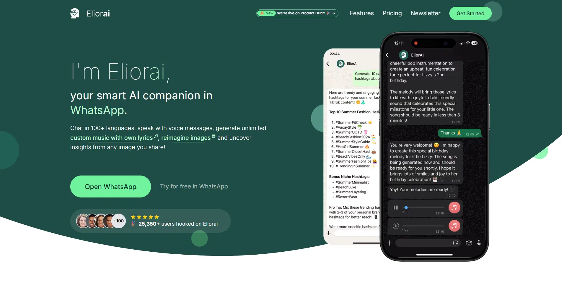 Elior AI is a smart WhatsApp companion that brings powerful AI tools straight into your chats, making conversations easier, more creative, and more fun. They let you chat in 100+ languages, send AI-powered voice replies, create custom music with your own lyrics, and even transform images or uncover hidden details from any photo you share.