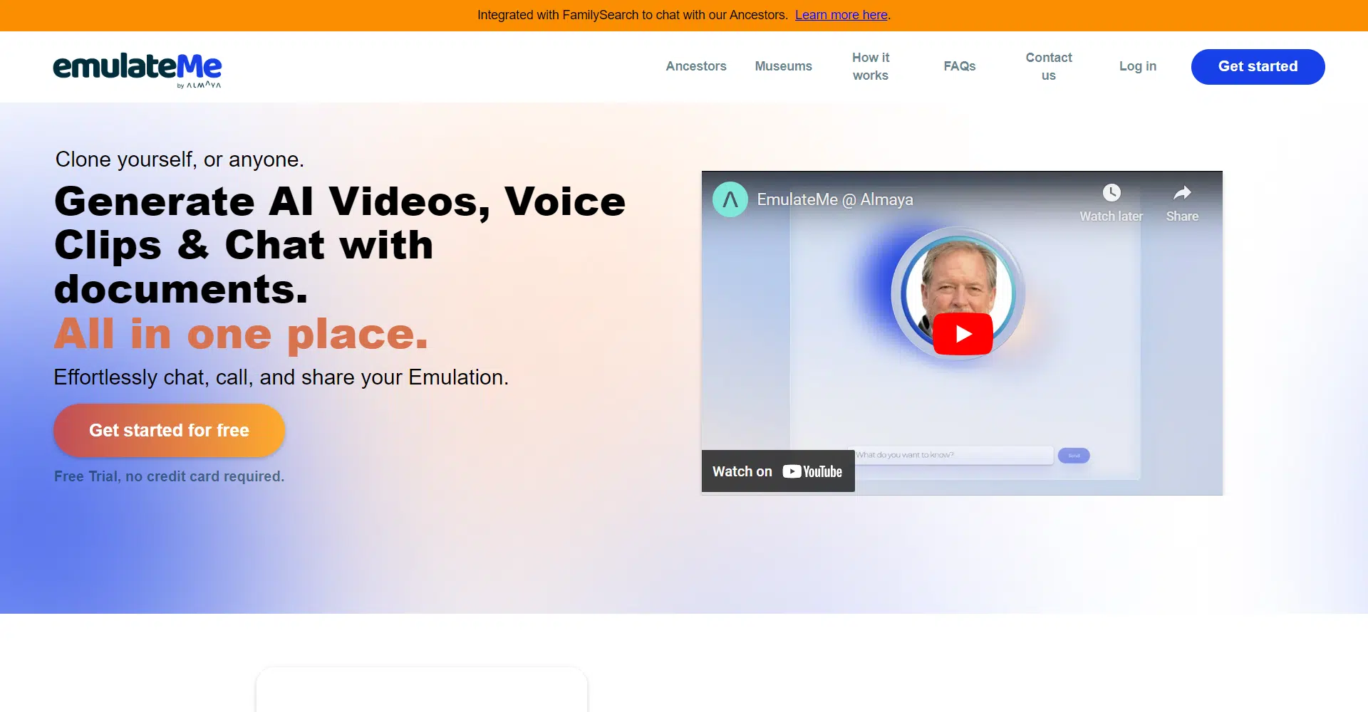 EmulateMe is a powerful AI tool that allows you to clone yourself, or anyone, into a fully interactive digital avatar. With EmulateMe, you can effortlessly create AI videos, voice clips, and even chat with documents, all in one place. Whether you’re looking to personalize an avatar to look and sound like you or need an AI that can communicate on your behalf, EmulateMe offers an easy and seamless way to achieve that.