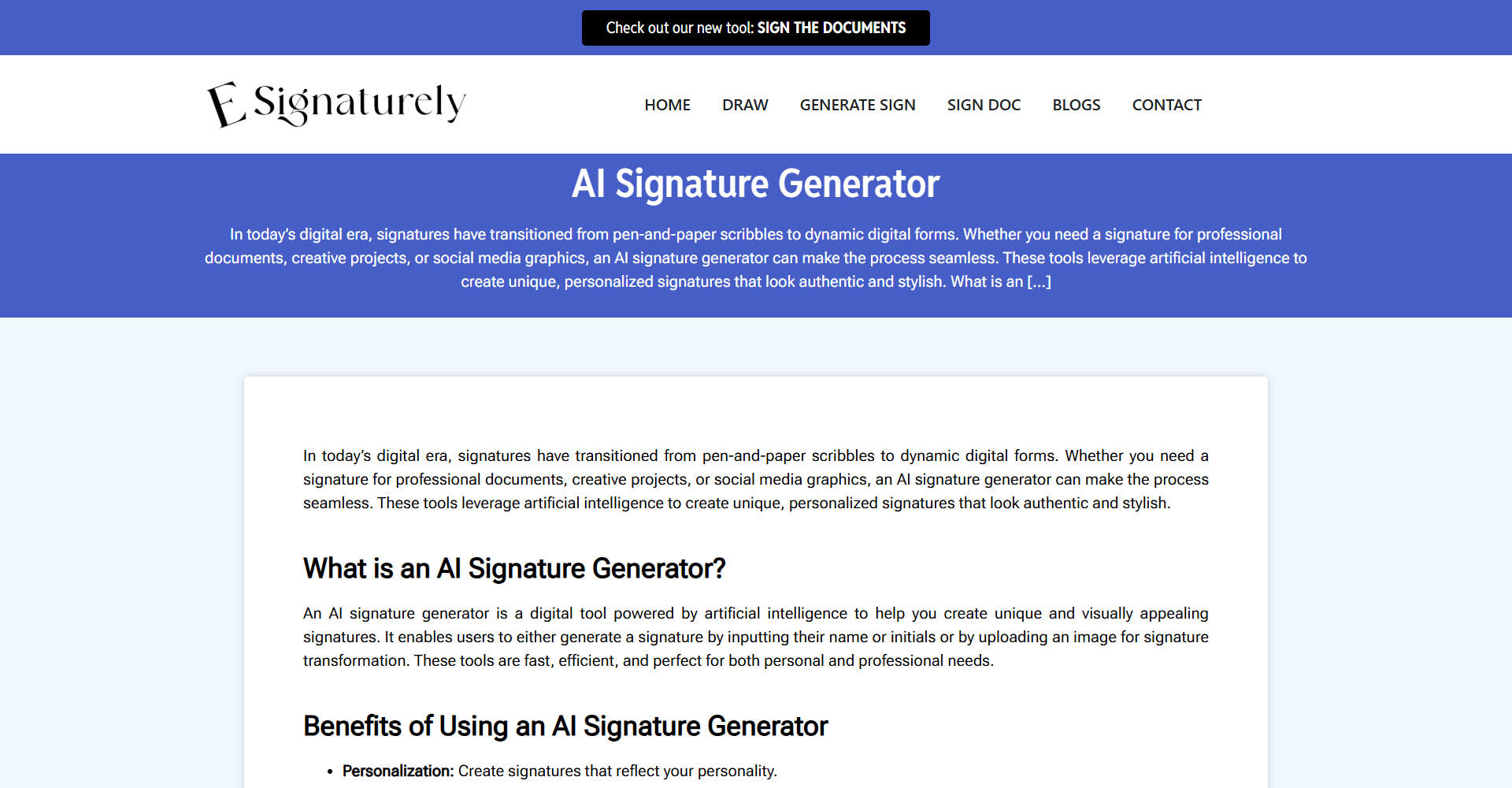 ESignaturely is an online signature generator that helps users create professional electronic signatures quickly without complicated steps or software. They make it simple to generate stylish signatures by entering your name and instantly getting multiple signature style options to choose from, making it useful for digital documents, contracts, and personal branding.