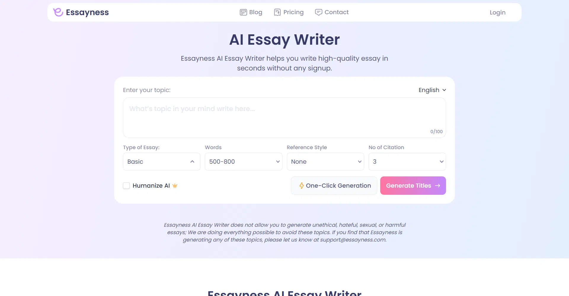 Essayness AI Essay Writer is the perfect tool for anyone who needs to write a high-quality essay in seconds. Whether you’re a student, professional, or just someone looking to polish your writing skills, this tool is simple, fast, and incredibly effective—with no sign-up required.