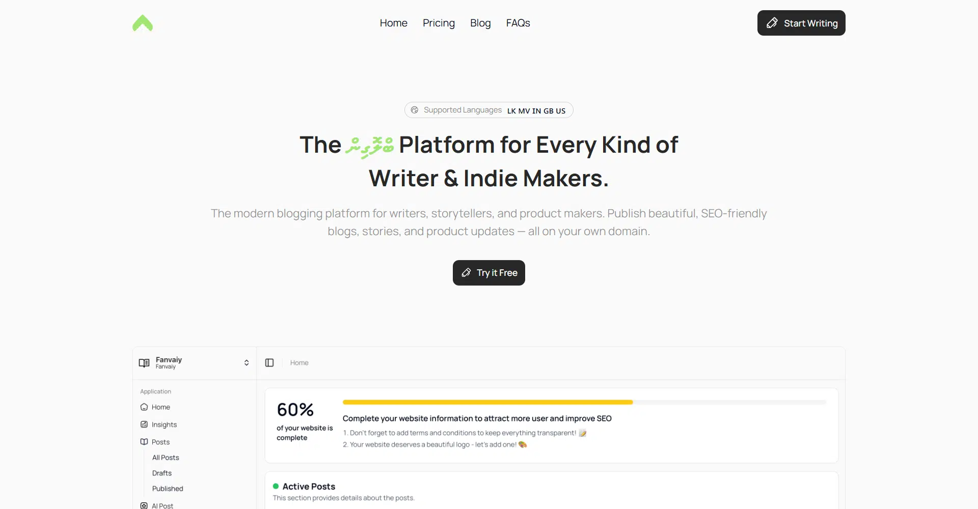 Fanvaiy is a modern blogging platform built for writers, creators, and indie makers who want to publish beautiful, high-performing content without technical friction. They make it easy for you to launch and manage a professional blog on your own domain, whether you are sharing stories, product updates, or long-form insights. Everything is designed to feel clean, fast, and creator focused, so you can spend more time writing and less time setting things up.