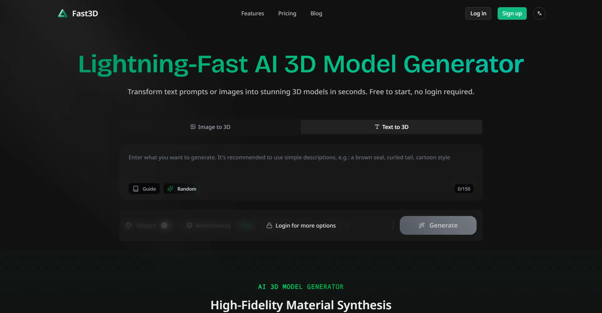 Fast3D is a lightning-fast AI 3D model generator that transforms simple text prompts or images into stunning, professional-grade 3D models in just 10 seconds. With no login required to get started, creators, designers, and developers can instantly bring their ideas to life using advanced AI-driven geometry and texture generation.