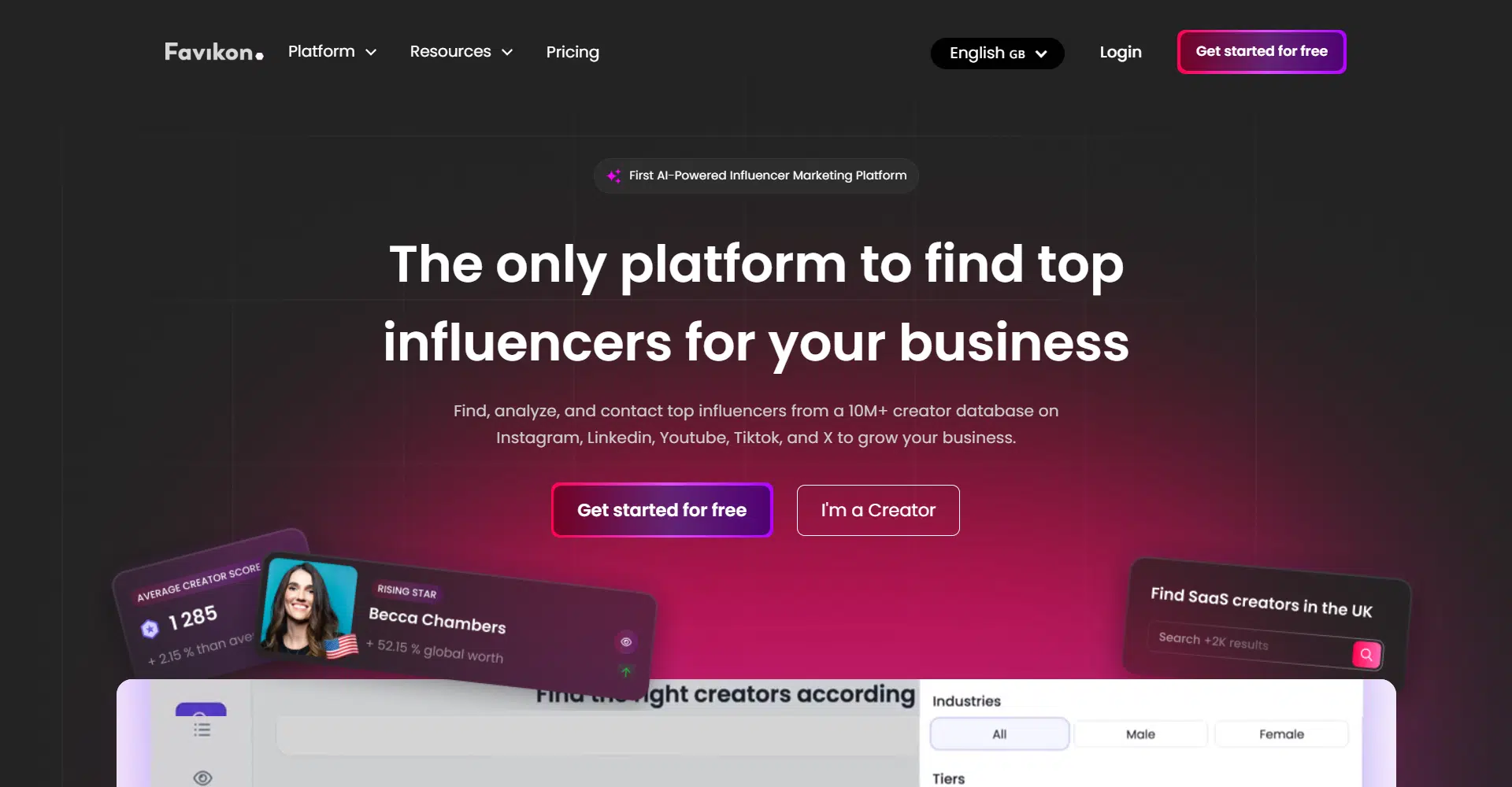 Favikon is the ultimate AI-powered platform for discovering, analyzing, and managing influencer marketing campaigns. With access to over 11 million creators across Instagram, LinkedIn, YouTube, TikTok, and X (Twitter), businesses can effortlessly find the right influencers to expand their reach and boost engagement. Whether you’re a B2B or B2C brand, Favikon provides the tools needed to connect with top creators and optimize your influencer marketing strategies.