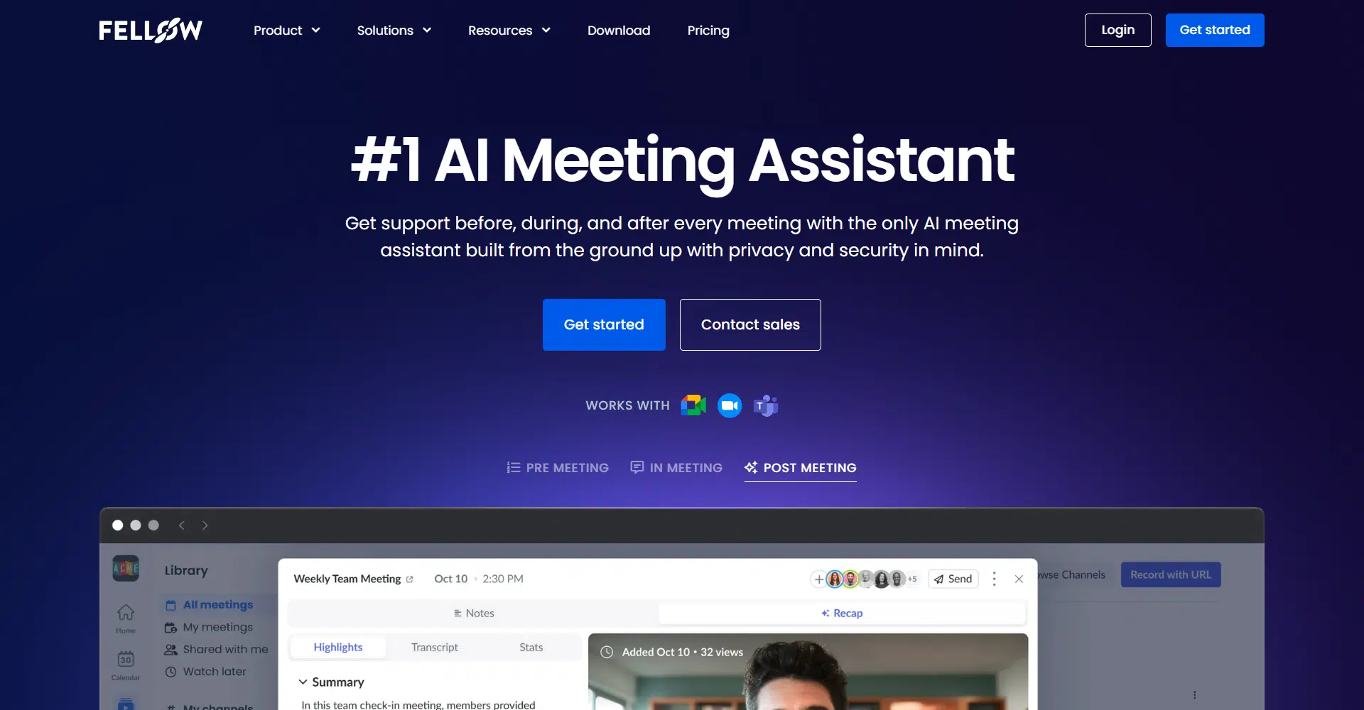 Fellow is the #1 AI meeting assistant designed to enhance meetings before, during, and after they happen. Built with privacy and security at its core, Fellow ensures that meeting recordings, notes, and summaries are centralized and accessible only to the right people.