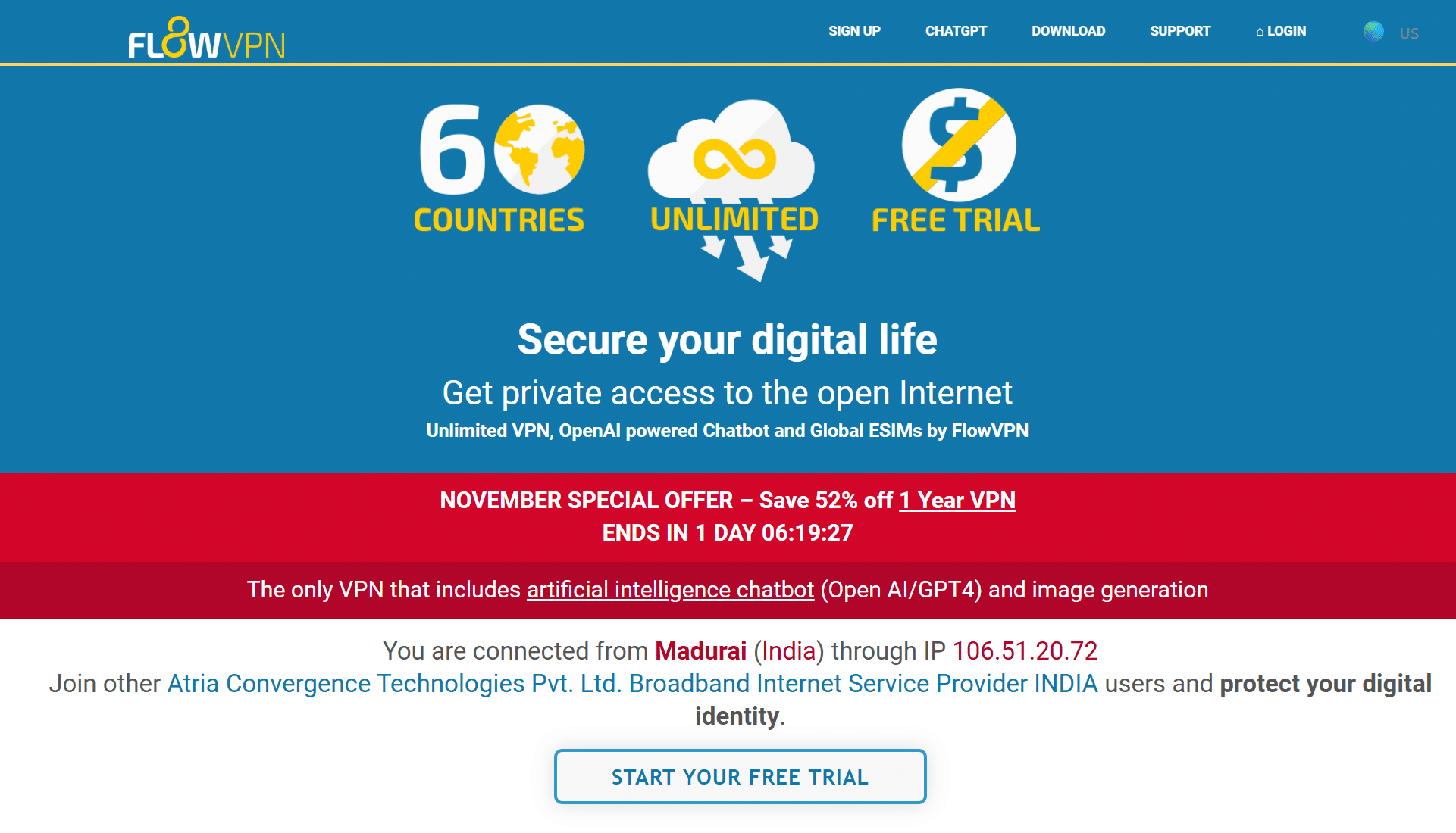Flow VPN includes exclusive AI-powered features, such as TurboGPT chatbot and AI image generation, making it more than just a VPN. Their network and apps are optimized for high-speed connections, reliability, and low-latency performance, and they provide real human support, not automated responses, so you can resolve issues quickly.