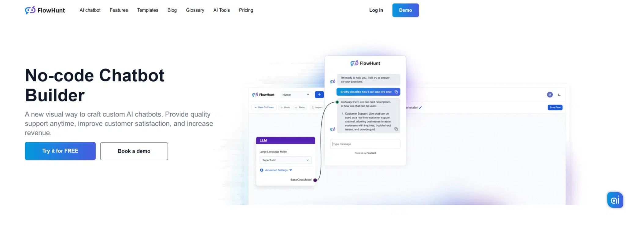 FlowHunt offers an intuitive, no-code platform to build custom AI chatbots that enhance customer support, boost sales, and streamline content creation. With FlowHunt’s visual builder, you can design and deploy chatbots quickly, without needing any coding skills. This user-friendly tool empowers you to create personalized conversational experiences by combining pre-built blocks, enabling you to deliver high-quality, responsive service to your customers.