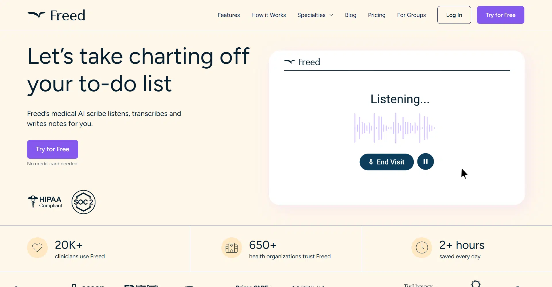 Freed is a purpose-built AI medical scribe designed to give clinicians their time, and joy, back. Loved by over 20,000 healthcare professionals, it helps doctors, nurses, and specialists focus on patient care instead of paperwork. By listening to your patient visits in real time, Freed automatically generates accurate, detailed, and clinically formatted notes so you can spend less time charting and more time doing what truly matters.