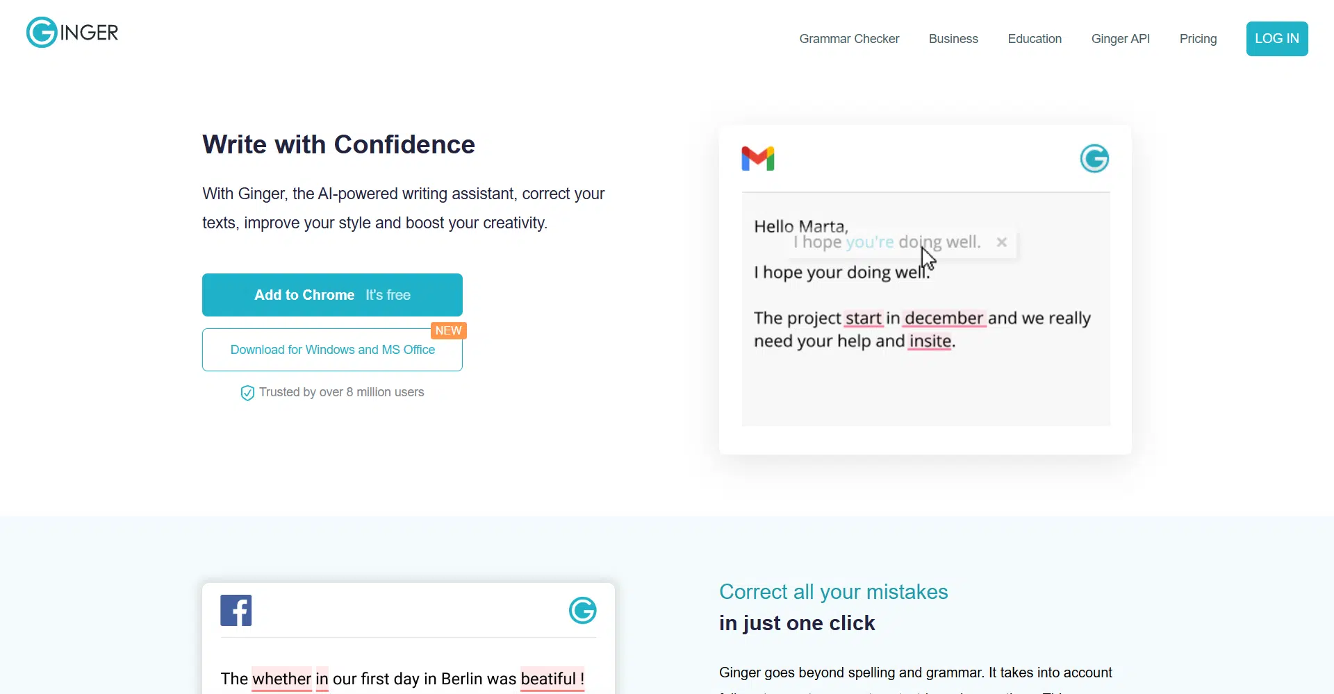 Trusted by over 8 million users, Ginger’s intelligent suggestions also work on mobile apps, ensuring your emails and texts are error-free while you’re on the go. Additionally, the platform offers a Windows and Mac desktop app and integrates seamlessly with multiple tools, ensuring you’re always supported no matter where you’re writing.
