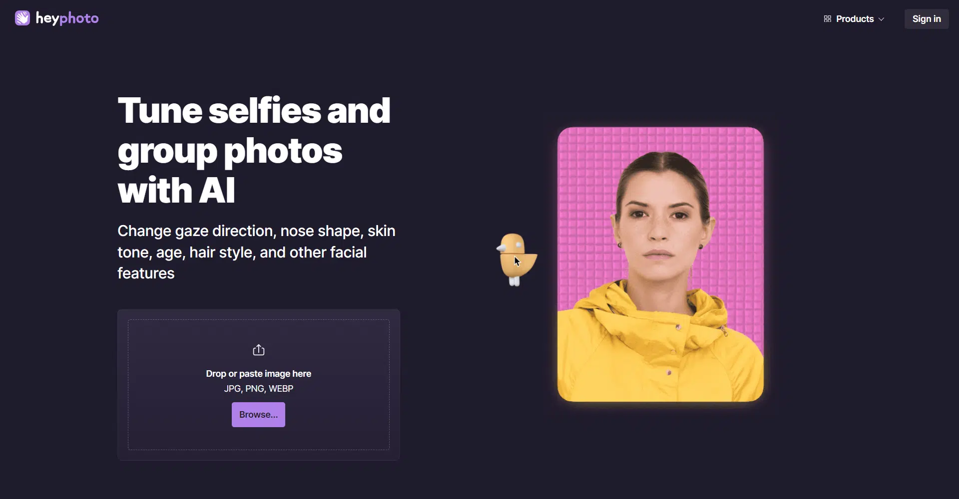 Step into the future of photo editing with our revolutionary AI-powered app! Transform your selfies and group photos like never before by tweaking gaze direction, nose shape, skin tone, age, and even experimenting with different hairstyles. Our user-friendly interface allows you to effortlessly drop or paste images in JPG, PNG, or WEBP formats, bringing your creative vision to life.
