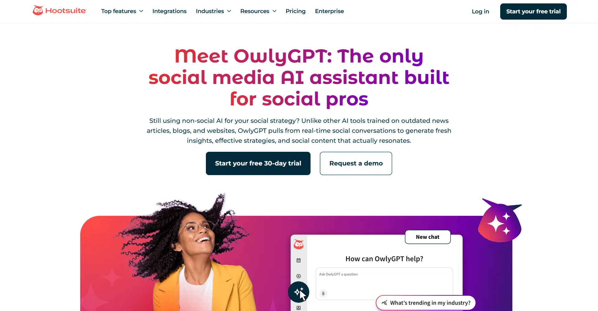 Hootsuite is the ultimate platform for social media professionals who want to stay ahead of trends, create engaging content, and manage multiple networks seamlessly. Its AI assistant, OwlyGPT, is built specifically for social media, pulling insights from real-time conversations instead of outdated articles, ensuring your content is always fresh, relevant, and tailored to your audience.