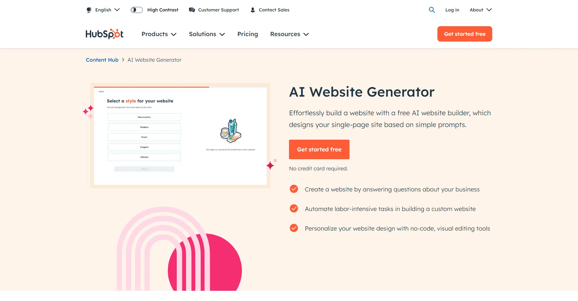 HubSpot’s AI Website Generator offers a seamless way for businesses to create custom websites without the need for coding or complex design processes. They allow you to build a single-page site effortlessly by simply answering a few questions about your business. The AI-driven generator handles the intricate work, automating labor-intensive tasks and delivering a website tailored to your specific needs.